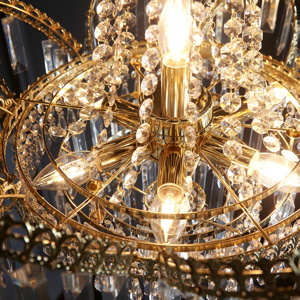 Create the perfect centrepiece for the most loved room of your home with this opulent 9 light pendant. Featuring a striking mix of intricate glass faceted beads and droplets, finished in a gold coloured plate.