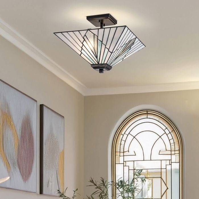 Bringing a modern simplicity to Tiffany Style art glass lighting, the Alderley family is characterised by precise straight lines and a refined colour palette. When lit, the blue panels take on a gorgeous aqua tone and the textured panels simply sparkle. The metal components in these products are finished with a rich Vintage Bronze and feature classic art deco styling.