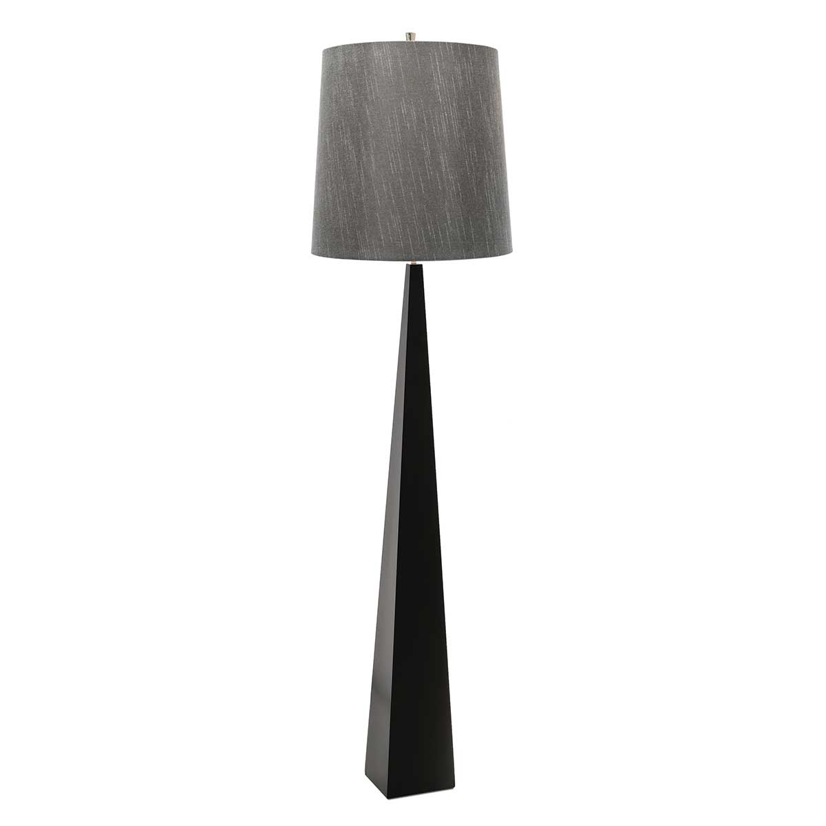 Black-painted steel tapered column floor lamp with Polished Nickel accents. Includes a Dark Grey faux silk hard-backed shade.