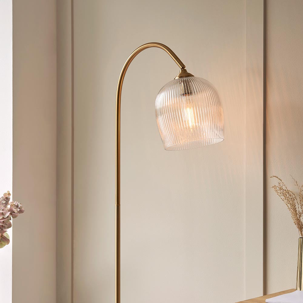 Bring timeless illuminated elegance to any space with this clean line floor lamp, featuring an adjustable head. The gracefully curved stem in a warm brass metal finish is complemented by a ribbed domed glass shade, offering both style and function. Ideal for reading nooks, lounge areas, or bedrooms, its adjustable design allows you to direct light exactly where it's needed.