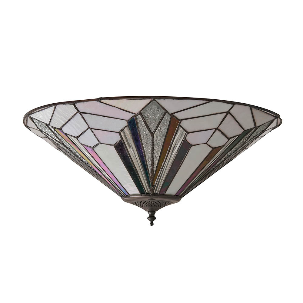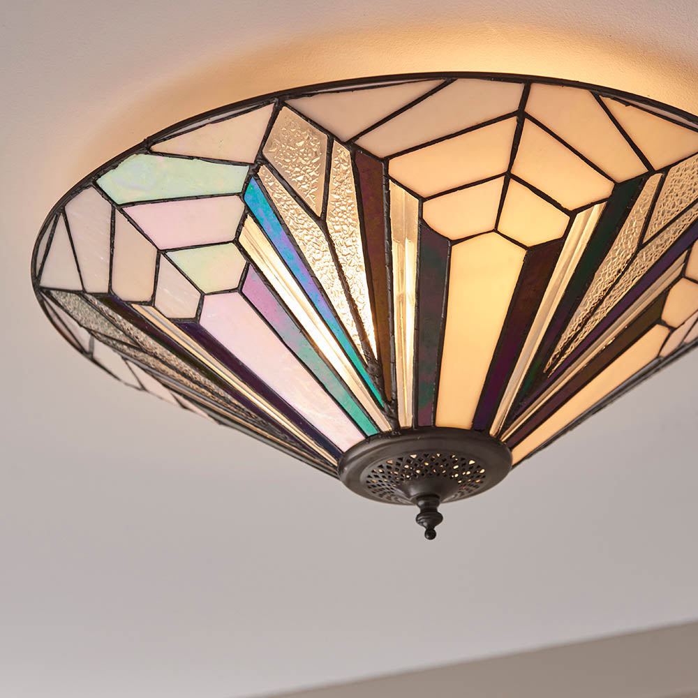 The Astoria 2 light flush uses dynamic lines in true art deco style. It uses bevelled and textured glass producing a stunning light effect. Compatible with LED lamps and matching items available