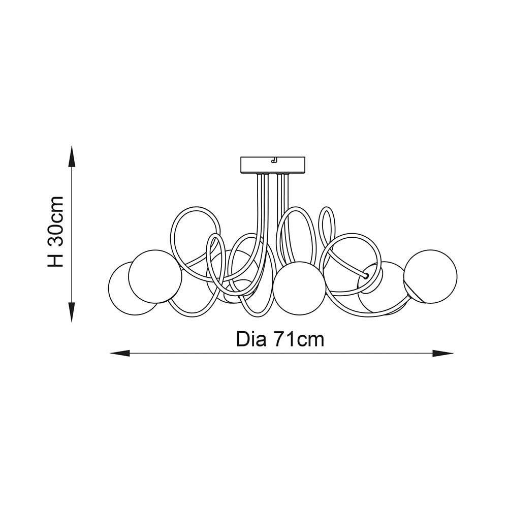 A modern style ceiling light with flowing loop arms, finished in chrome, each clear glass shade is filled with thin wire and threaded with glass beads to create a striking light pattern.