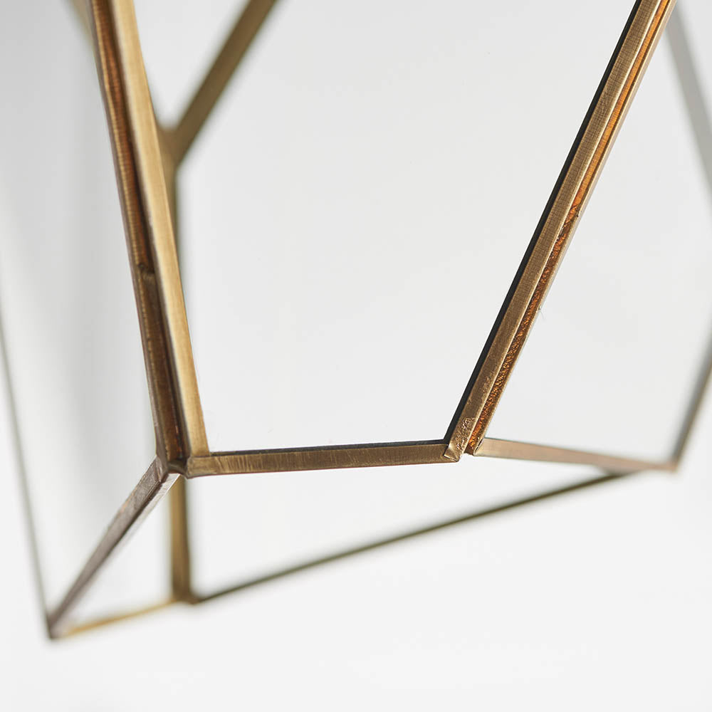 An angular cage pendant made from glass panels with an antique brass effect trim. Compatible with LED lamps and dimmable.