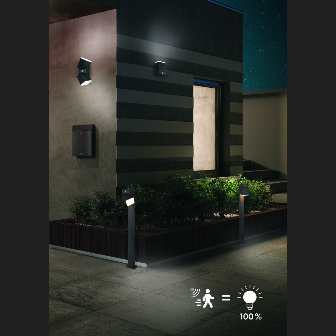 Modern, innovative design meets multifaceted functionality - the outdoor light AVON as an eye-catcher in your outdoor area. Thanks to the swiveling light element, the light fall can be adjusted individually according to your needs. Whether you use the luminaire as a decorative light ambience for your house wall or as a perfect illumination of your entrance area, the AVON skillfully sets itself in scene. With the help of the integrated sensor, the luminaire automatically switches on to 100% light intensity when motion is detected. In darkness as well as during motionlessness, an orientation light with a 10% light intensity lights up. In addition, this modern luminaire is particularly weather resistant due to its IP 54 rating. The wall lamp convinces with a housing made of anthracite-coloured die-cast aluminum and a lampshade made of white plastic. In addition, the luminaire features modern LED technology, which is characterised by high light quality and energy efficiency. Compared to conventional halogen lamps, up to 80% of energy costs can be saved. In addition, LED light sources have a long service life, produce less heat and protect the environment.