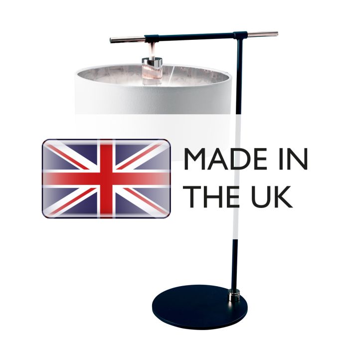 Two-tone table lamp finished in Black with Polished Nickel accents. This portable includes a white cylinder shade with silver mirror laminate lining. Made in England. LS260-A