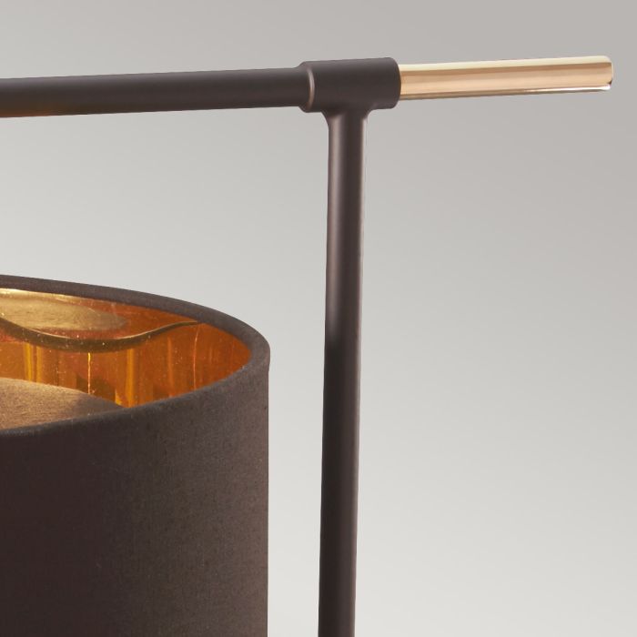 Two-tone table lamp finished in Brown with Polished Brass accents. This portable includes a brown cylinder shade with gold mirror laminate lining. Made in England. LS260-B