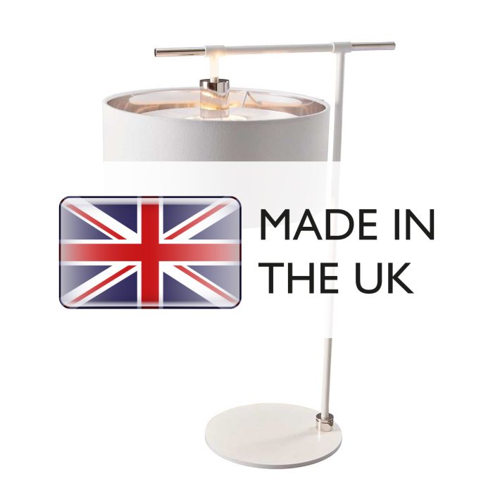 Two-tone table lamp finished in White with Polished Nickel accents. This portable includes a white cylinder shade with mirror silver laminate lining. Made in England. LS260-A