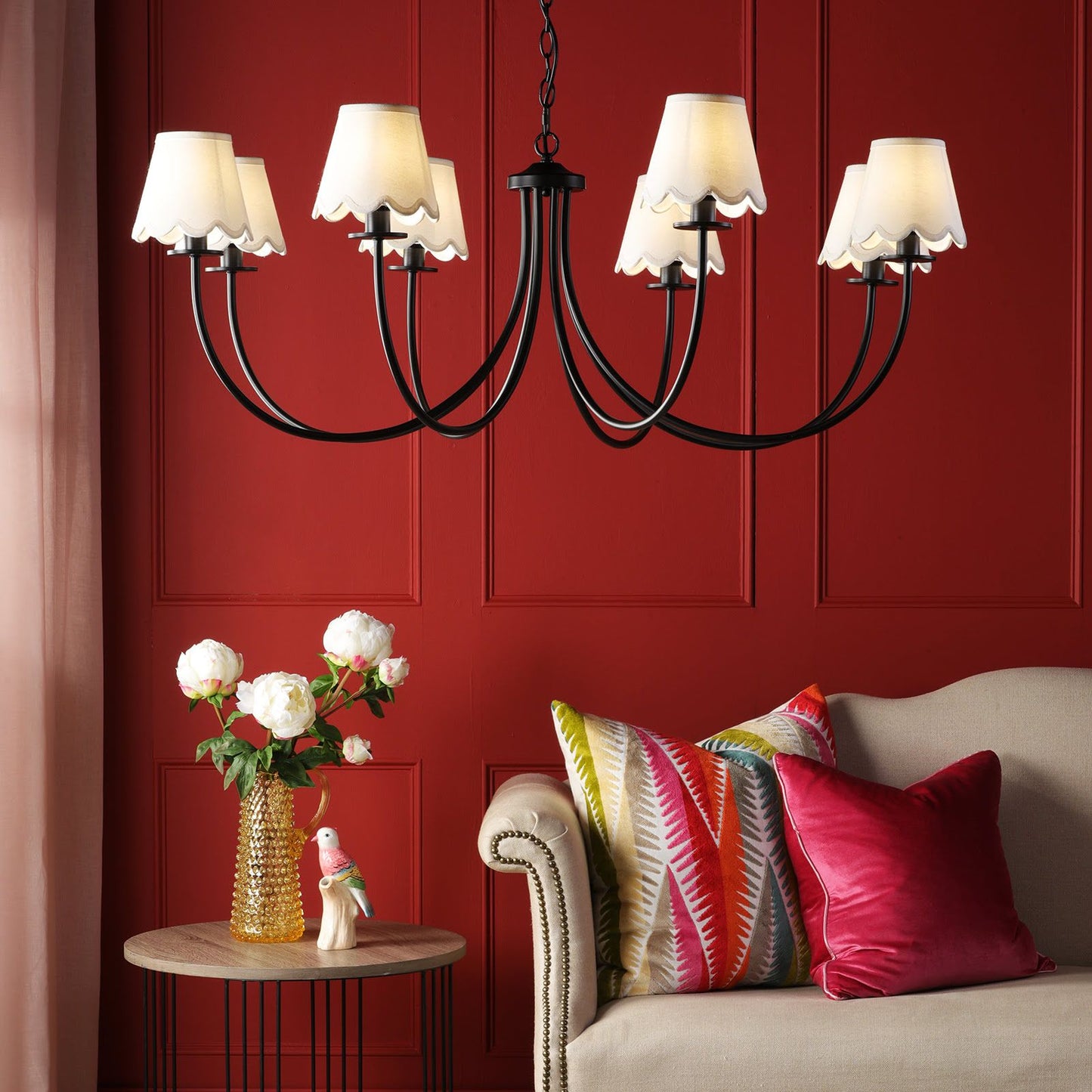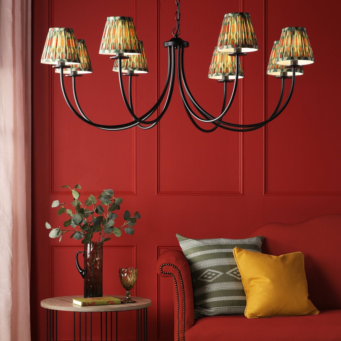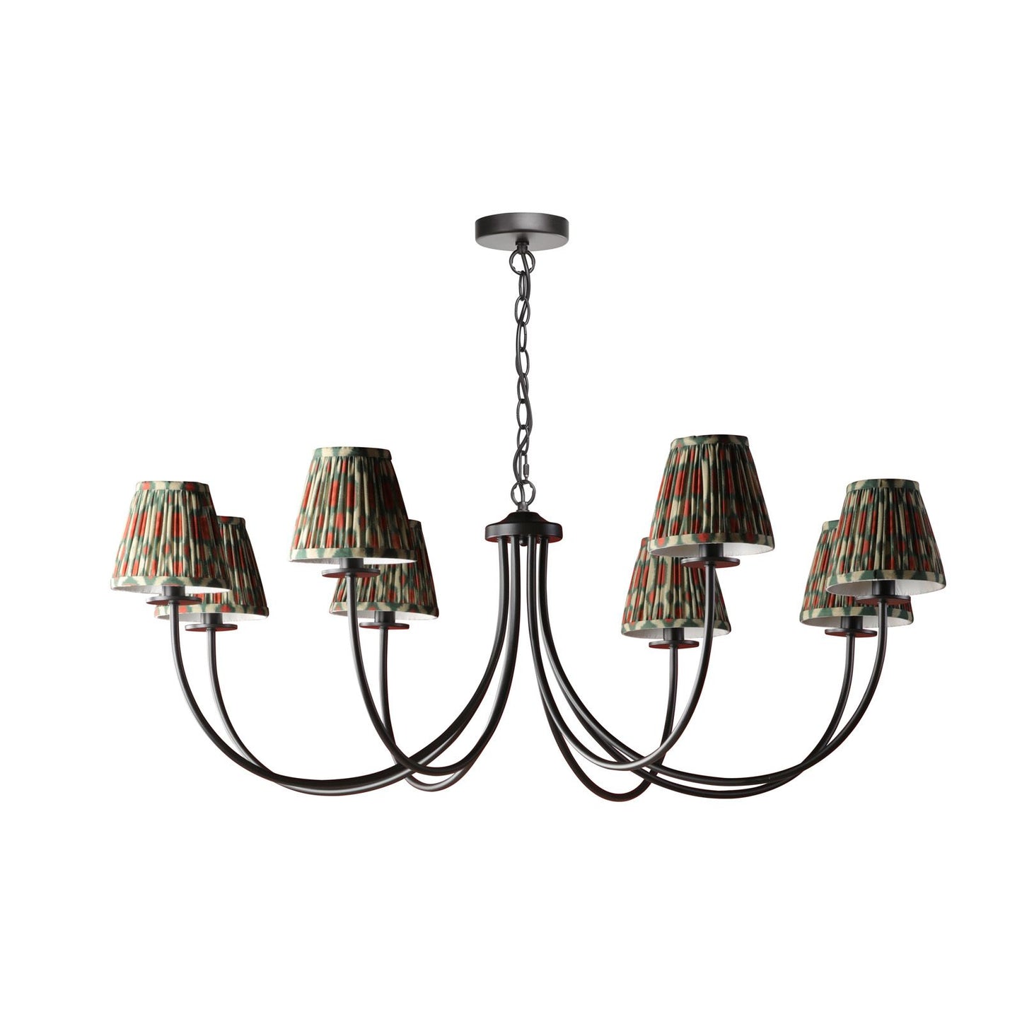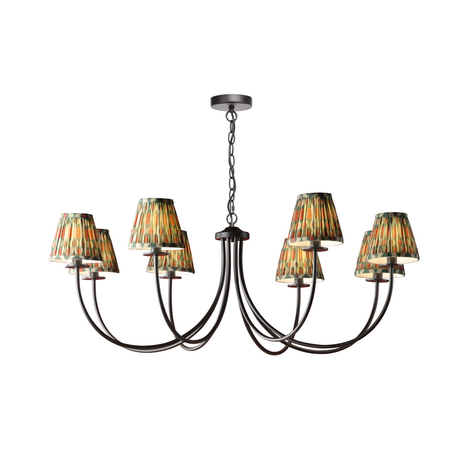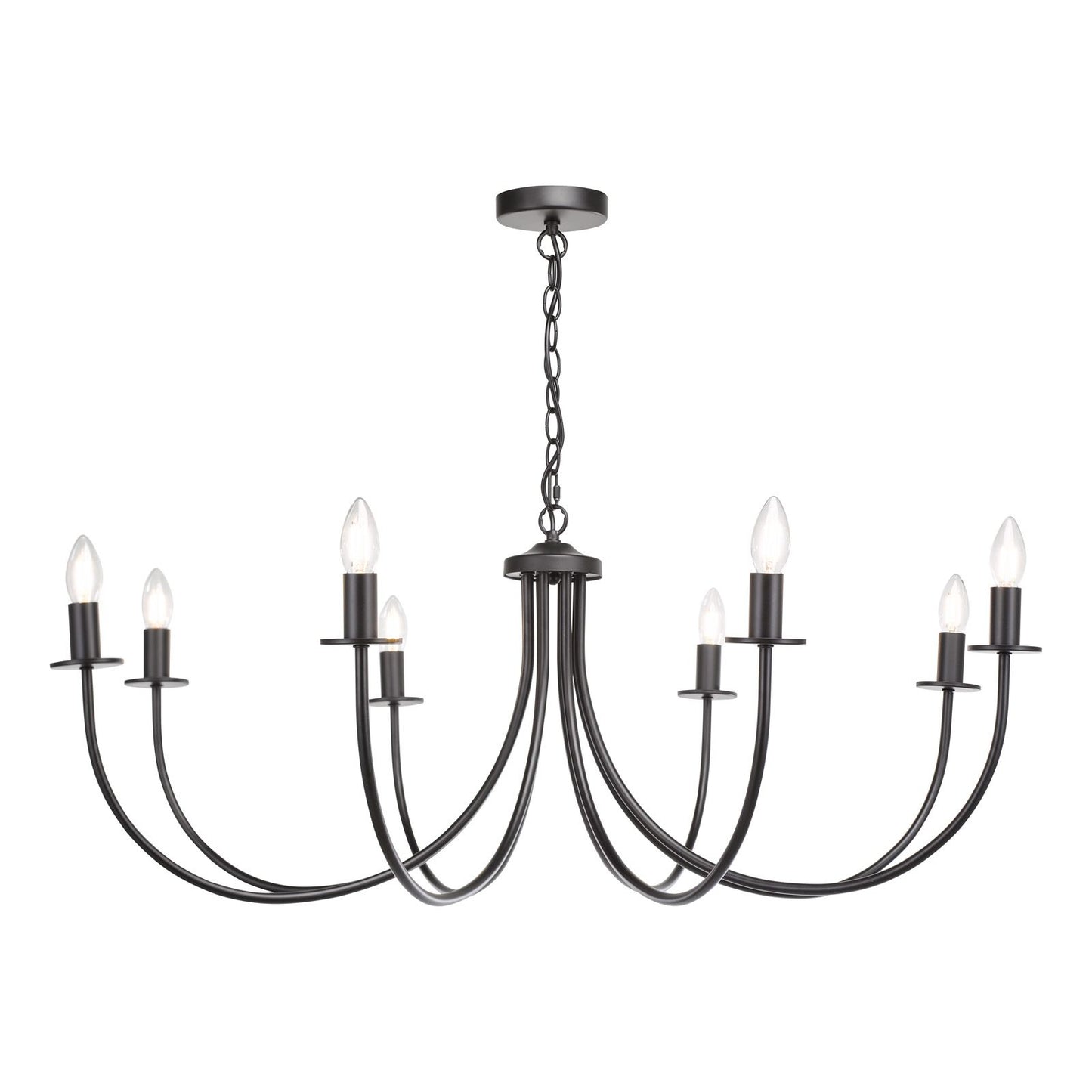 Looking for a statement-making black ceiling light? The Becca pendant light from Dar Lighting is your answer. This large ceiling light boasts a striking one-metre diameter, perfect for illuminating spacious rooms with its eight sweeping arms. The matte black finish exudes contemporary elegance, while its versatile design allows for endless customization. Use it with or without shades - it's compatible with small options up to 20cm, including trendy Ikat or scallop styles. The Becca pendant light comes with 2m of chain, making it ideal for higher ceilings too. Whether you're after a bold, shade-free look or a softer, diffused glow, this adaptable black pendant light is sure to become the centrepiece of your room.