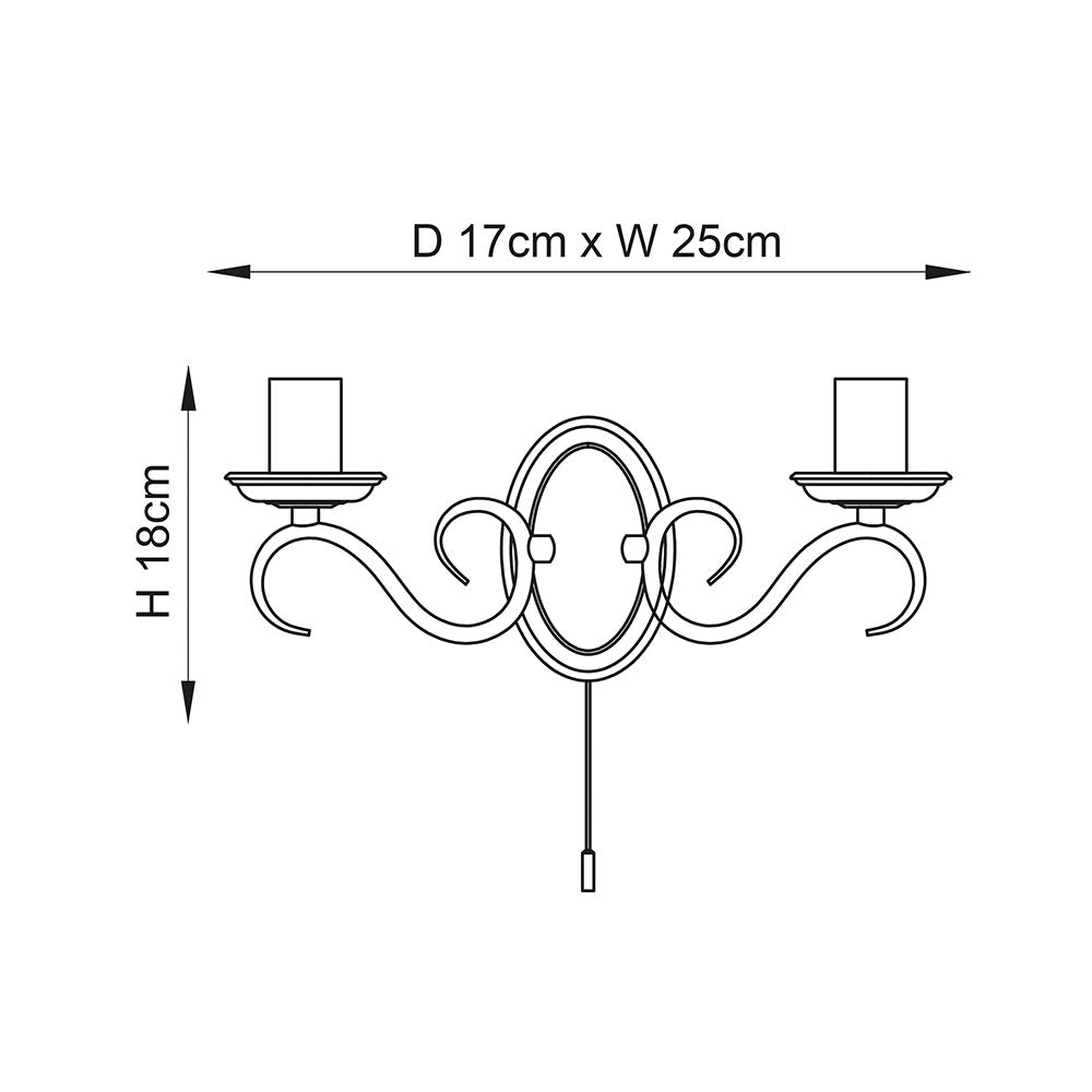 A twin wall light with scrolled arms in antique brass effect finish with pull switch. suitable for use with LED lamps and dimmable. Matching items available.