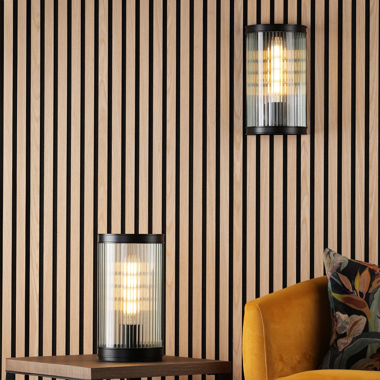 Elevate your space with this sleek Bianka ribbed glass wall light from dar lighting. This contemporary lighting fixture boasts a sophisticated matt black finish and textured glass shade, perfect for adding a touch of modern elegance to any room. The mirrored inner cleverly reflects light, amplifying its glow and creating a warm, inviting atmosphere. Ideal for hallway lighting or as a stylish bedside companion, this versatile piece complements a range of interiors. For a cohesive look, pair it with matching pendants and table lamps from the Bianka collection. The ribbed glass wall light works beautifully with tube light bulbs and crittall glass, allowing you to customise your lighting to suit your style. Transform your home with this stunning example of contemporary design from dar lighting.