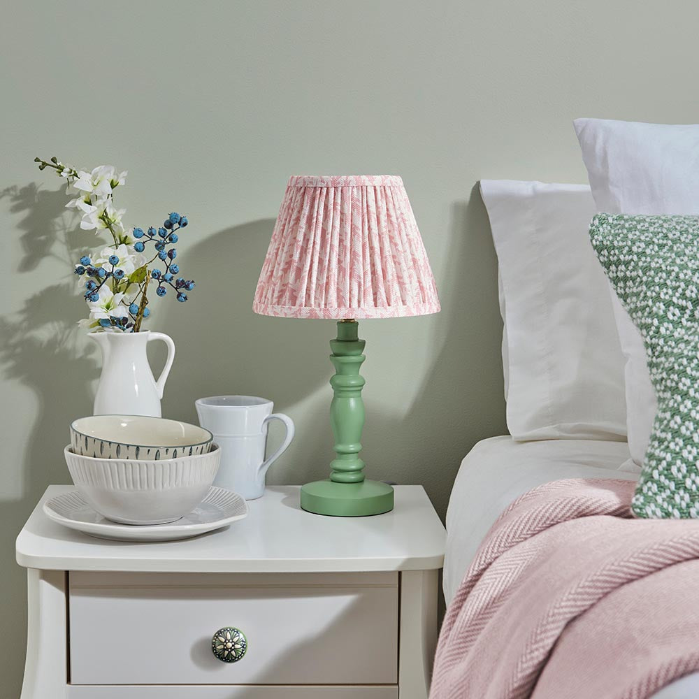 A beautiful wooden turned spindle light, painted satin Cotswold green. Perfect for classic interiors, featuring a brass B22 switched lamp holder and grey braided fabric flex. Paired with our subtle peachy keen 20cm Leaf shade for a unique, classic look.