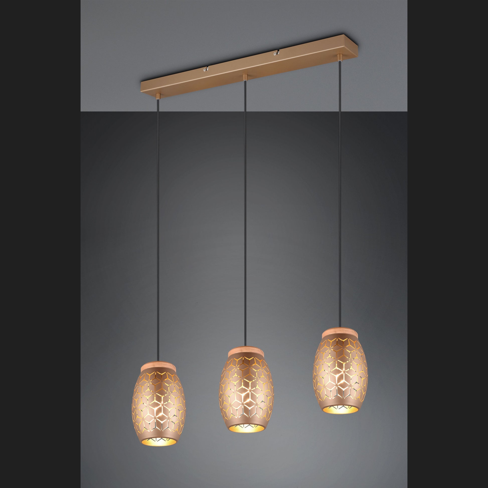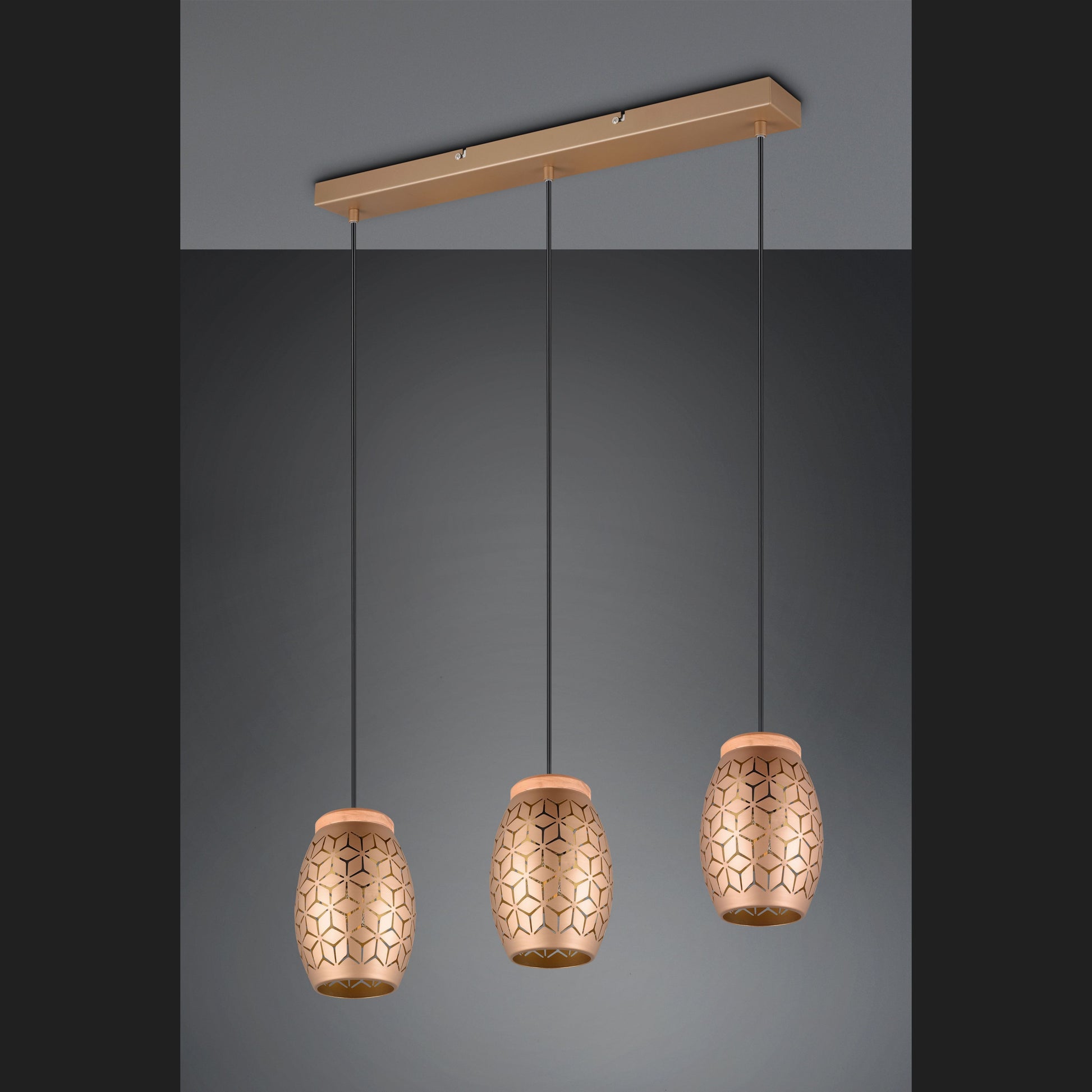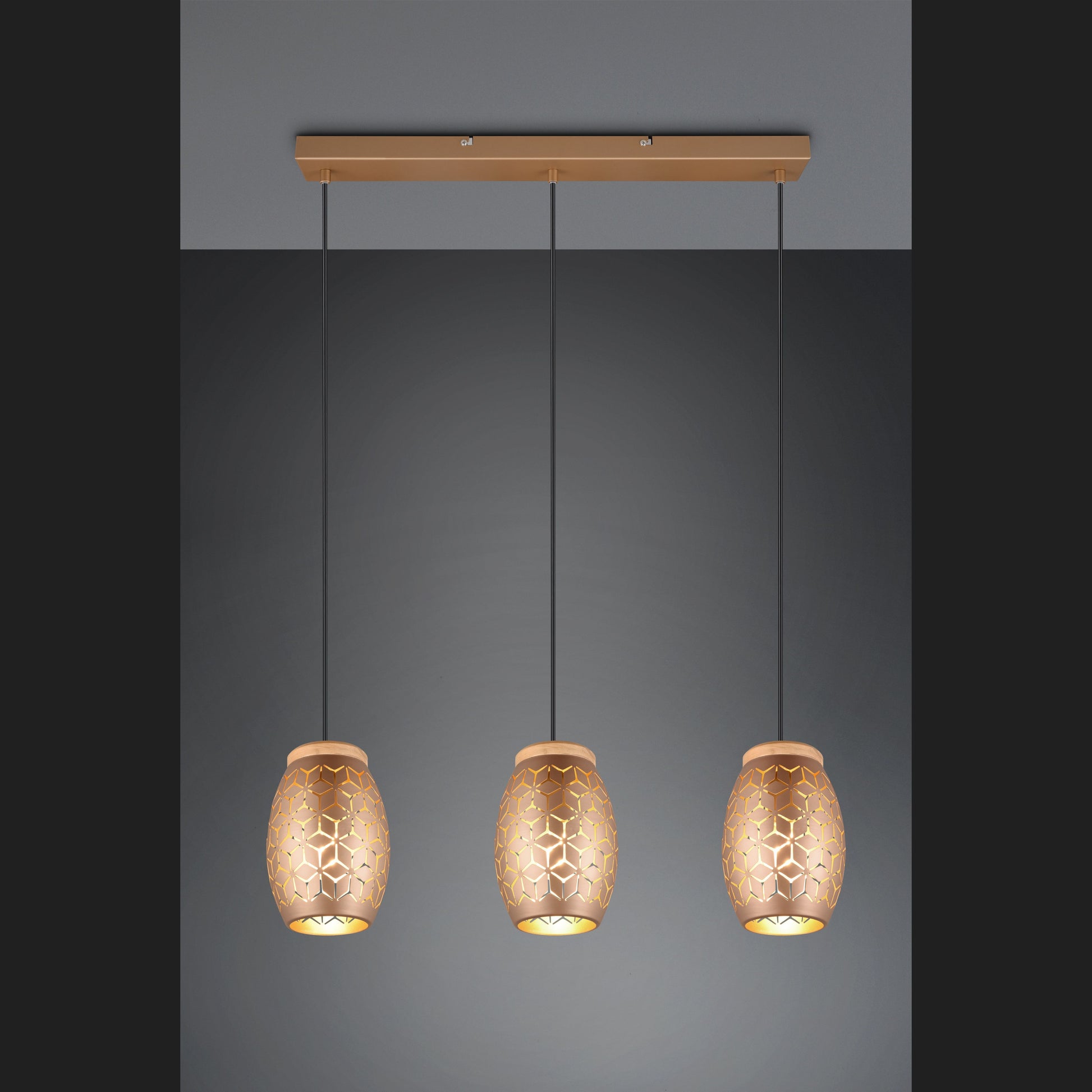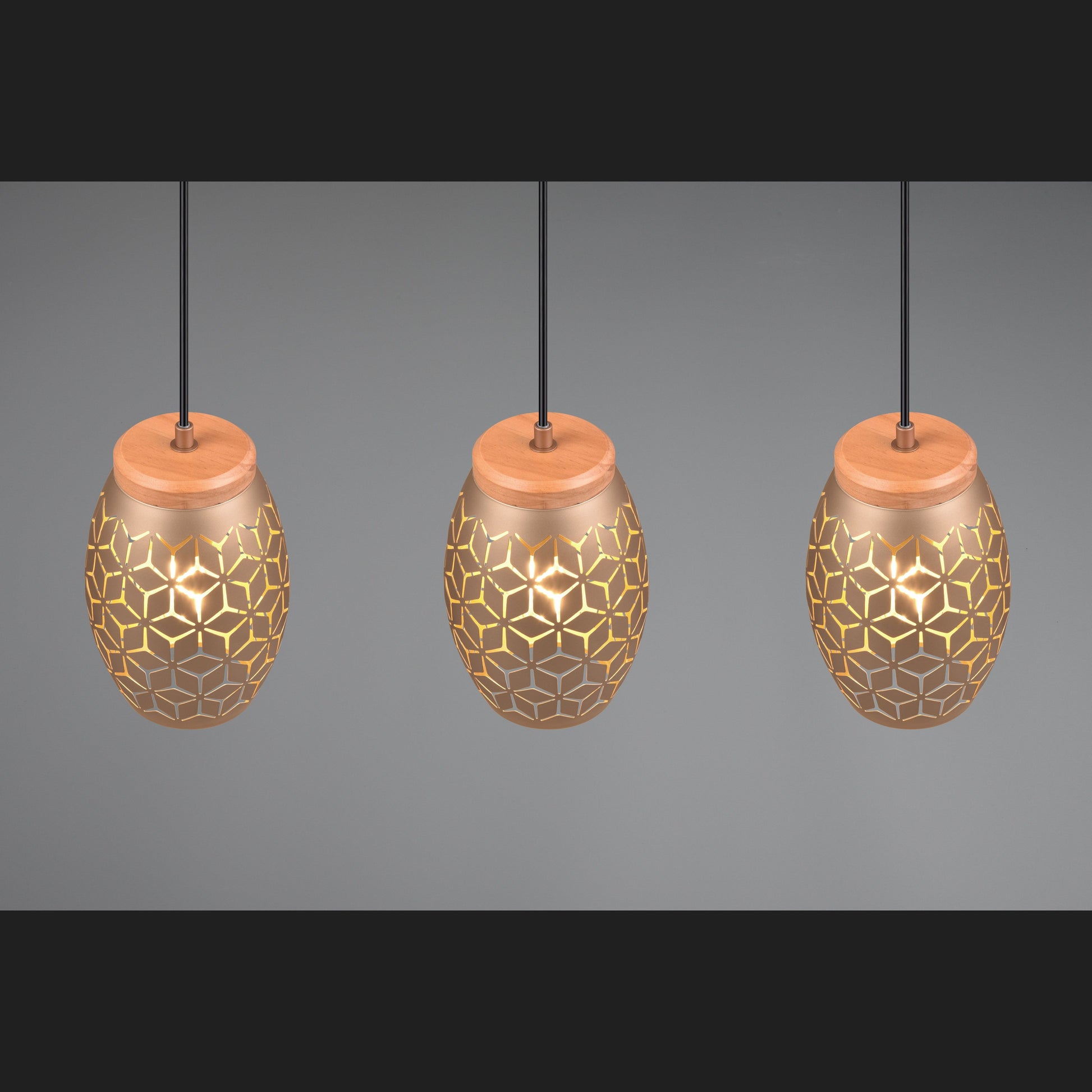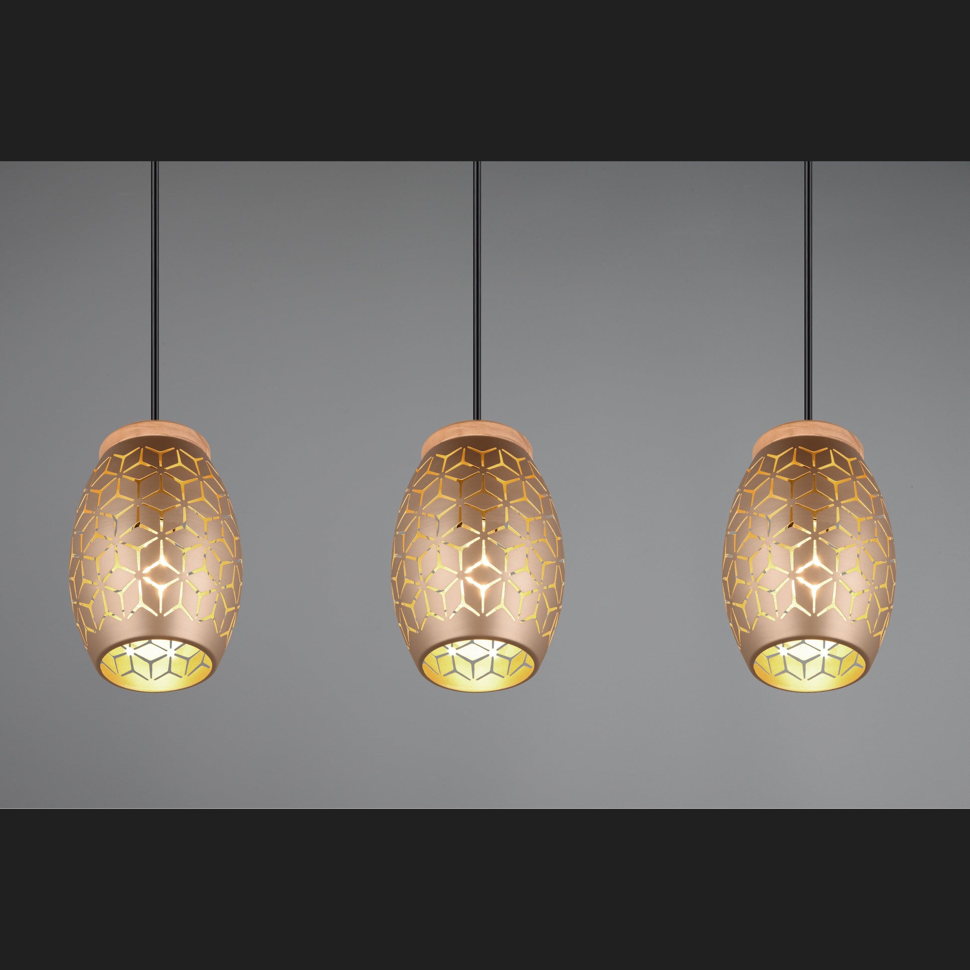 The three-light BIDAR pendant light brings a special feel-good light into your home and becomes the luminous centrepiece of any room. The light shines gently through the patterns and creates a unique play of light in the surroundings. The natural wood accents of the luminaire enhance the warm feeling of cosiness. The BIDAR is truly a visual highlight with a cosy flair! The metal in coffee and gold colour, the natural wood accents and the playful design language create an exciting decorative element for your four walls. The use of LED light sources is recommended for energy-saving lighting. These are an ideal alternative to conventional halogen light sources and offer high light quality and energy savings of up to 80%. With LED light sources, you also benefit from a long service life and low heat generation while protecting the environment.