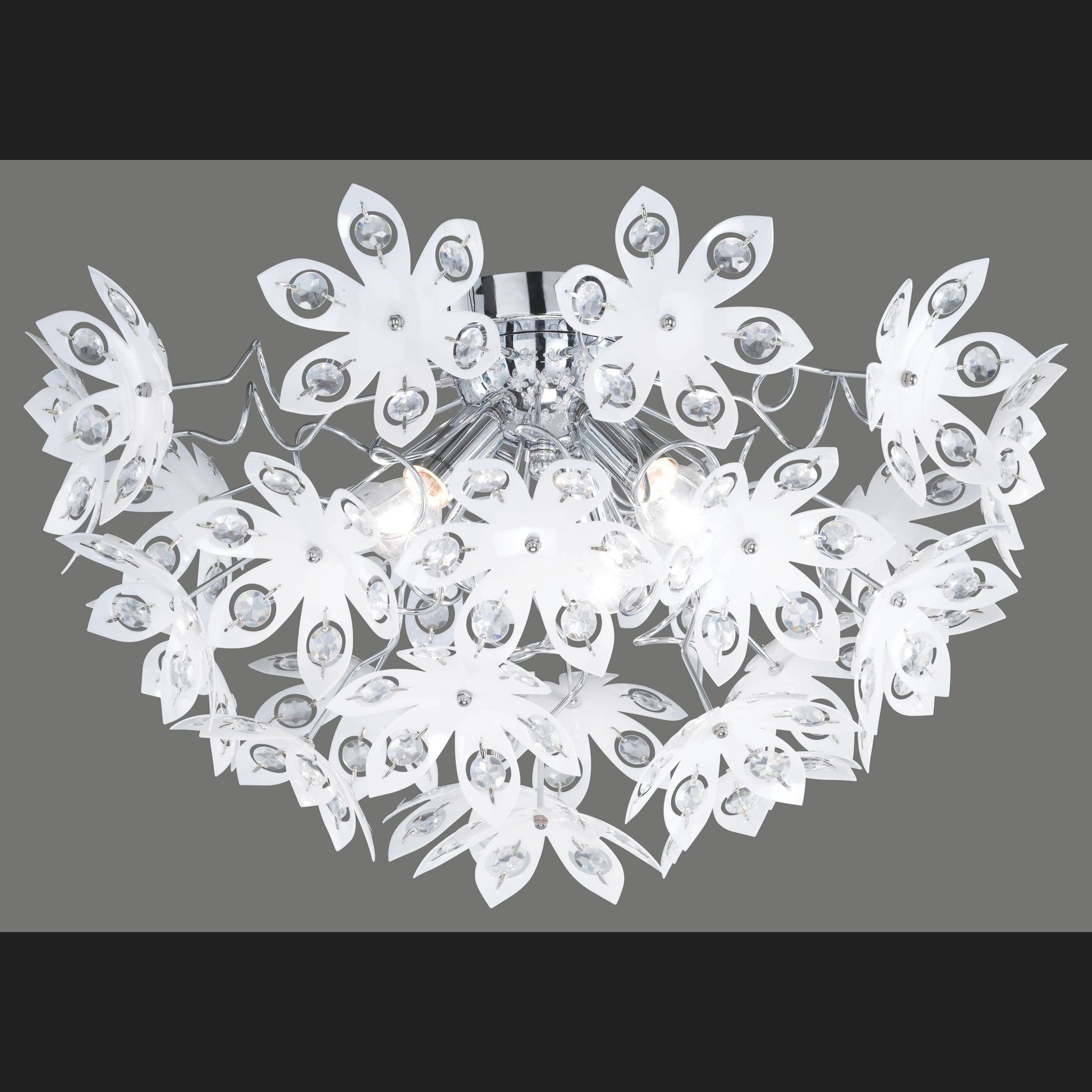 The ceiling light in the BLOWBALL series stands out from the crowd. The reason for this is the material used. This plastic is characterised by its high transparency and glossy surface. It has a diameter of 55 cm and a height of 30 cm. The luminaire is chrome coloured with white acrylic flowers and clear stones. For energy-saving lighting, it is recommended to use an LED illuminant. These are an optimal alternative to conventional halogen lamps and stand for a high quality of light and energy savings of up to 80%. In addition, LED lamps help you benefit from a long service life, low heat generation and at the same time protect the environment.