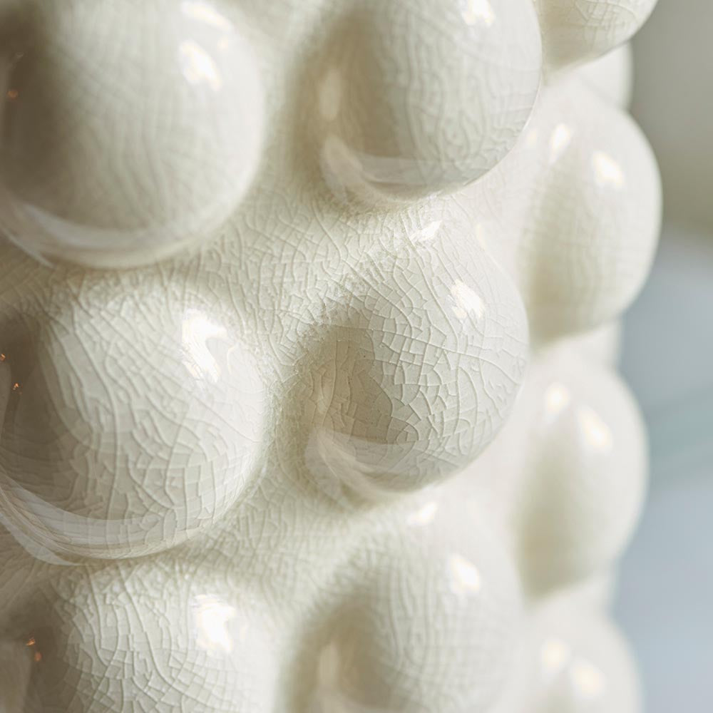 An interior must have, this playful ceramic base features sculptured bobble shapes finished in a gloss vintage white crackle glaze. With switched brass B22 lamp holder and grey braided flex, pair with one of our 35cm decorative fabric shades for the perfect interior addition.