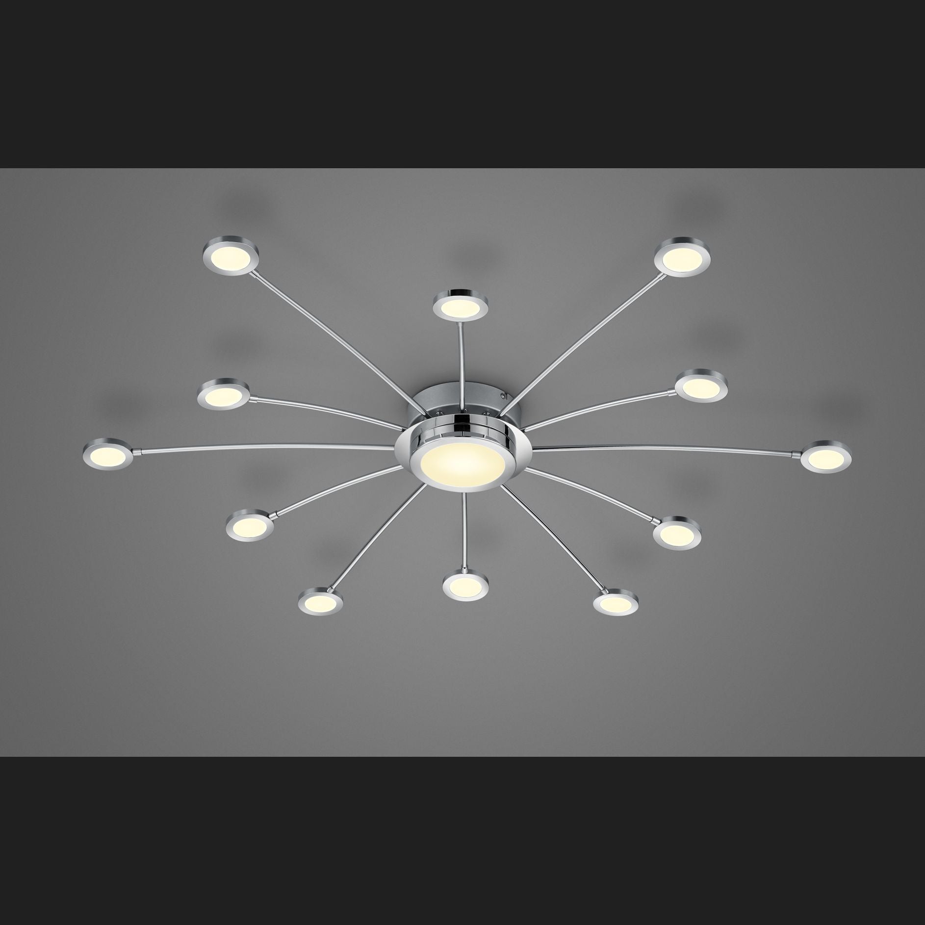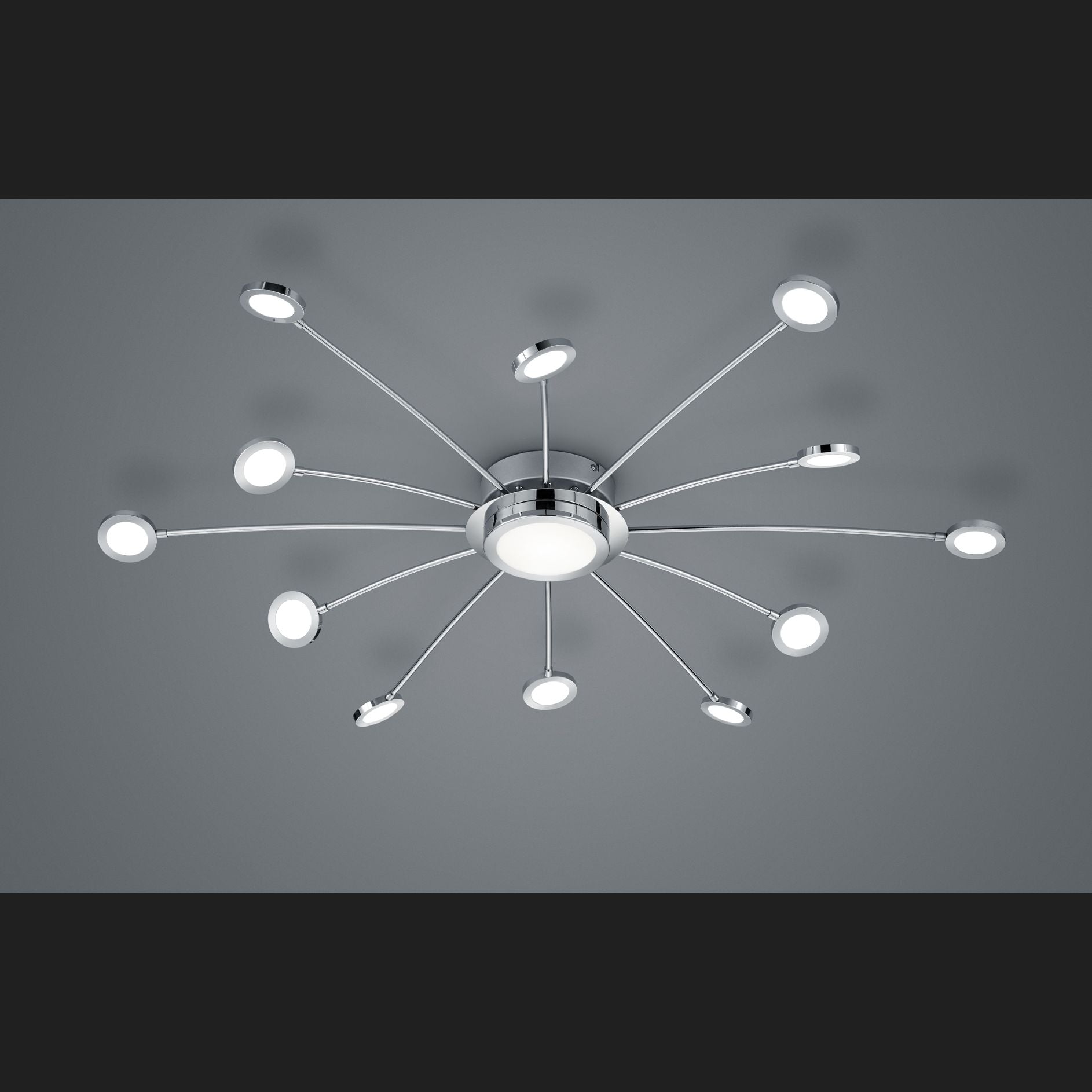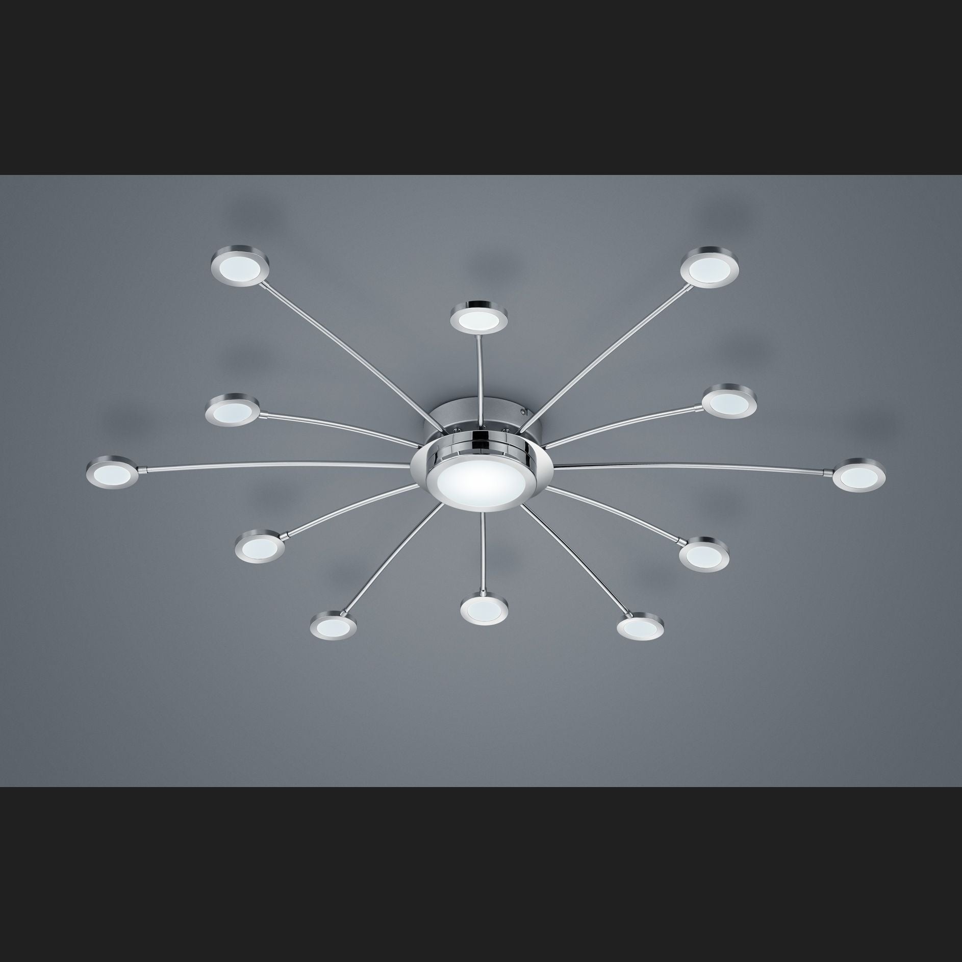 The chrome-coloured BODRUM ceiling light impresses with its modern yet neutral design. Create an ambience just the way you want it and be impressed by its versatility. Both the light colour and light intensity can be regulated and individually adjusted using the included remote control. The twelve light arms and the light element in the centre can be adjusted and dimmed from a warm white light colour (3000 Kelvin) to a cool white light colour (6500 Kelvin). The built-in memory function saves the last selected light setting and uses it when the light is switched on again. The luminaire also has a night light that can only be switched on using the remote control. The ceiling light has a diameter of 100cm and can therefore be perfectly integrated into your living room or bedroom.