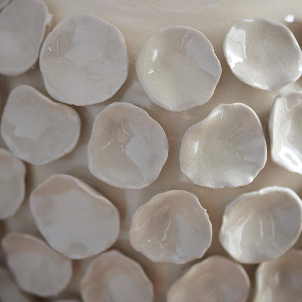 Inspired by nature, this hand decorated sculptured ceramic table light is finished in a gloss vintage white crackle glaze; with a switched brass B22 lamp holder and natural colour braided flex. Paired with our subtle pearl grey 35cm Leaf shade for the perfect interior addition.
