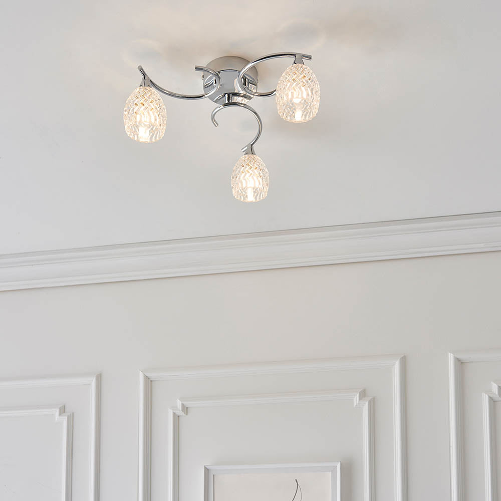 A 3 light flush ceiling fitting with curved metal arms in a chrome finish, and cut glass shades. suitable for use with LED lamps and dimmable. Matching items and other colour options available