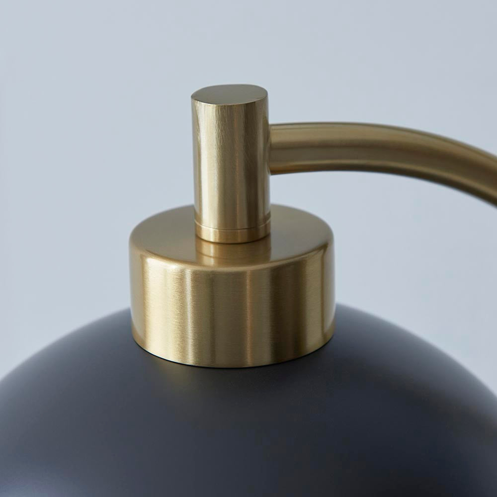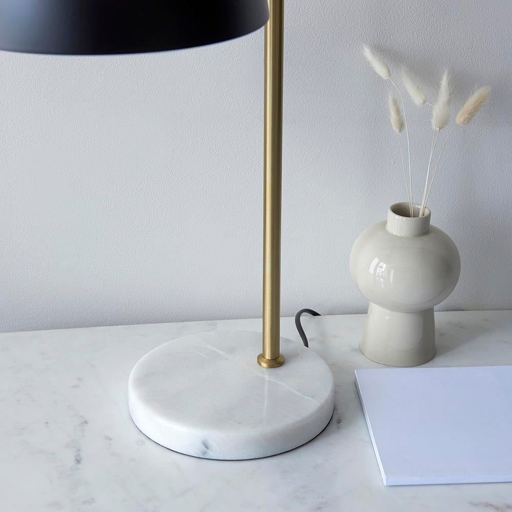 Inspired by the clean lines of mid-century design this mixed finish table light features a white and grey marble base, antique brass stem with smart matt black shade and in-line switch.