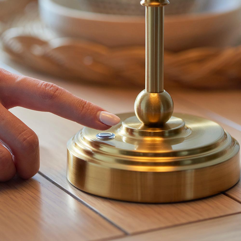 Not tied down by the need for a power cable, this portable, rechargeable 3 stage touch dimmer table lamp enables you to select your own level of light. Classic in style and finished in aged brass making it easy to place around your home. Turn on for low light then touch controlled to increase light level to medium then bright, making it the perfect bedside light. Taking just 5.5 hours to fully charge and giving up to 36 hours of continuous light. Place on shelving, hallways, bedsides or dining tables, a truly versatile addition to your home. Paired with our natural 16cm Ikat clip-on shade for the perfect timeless style.