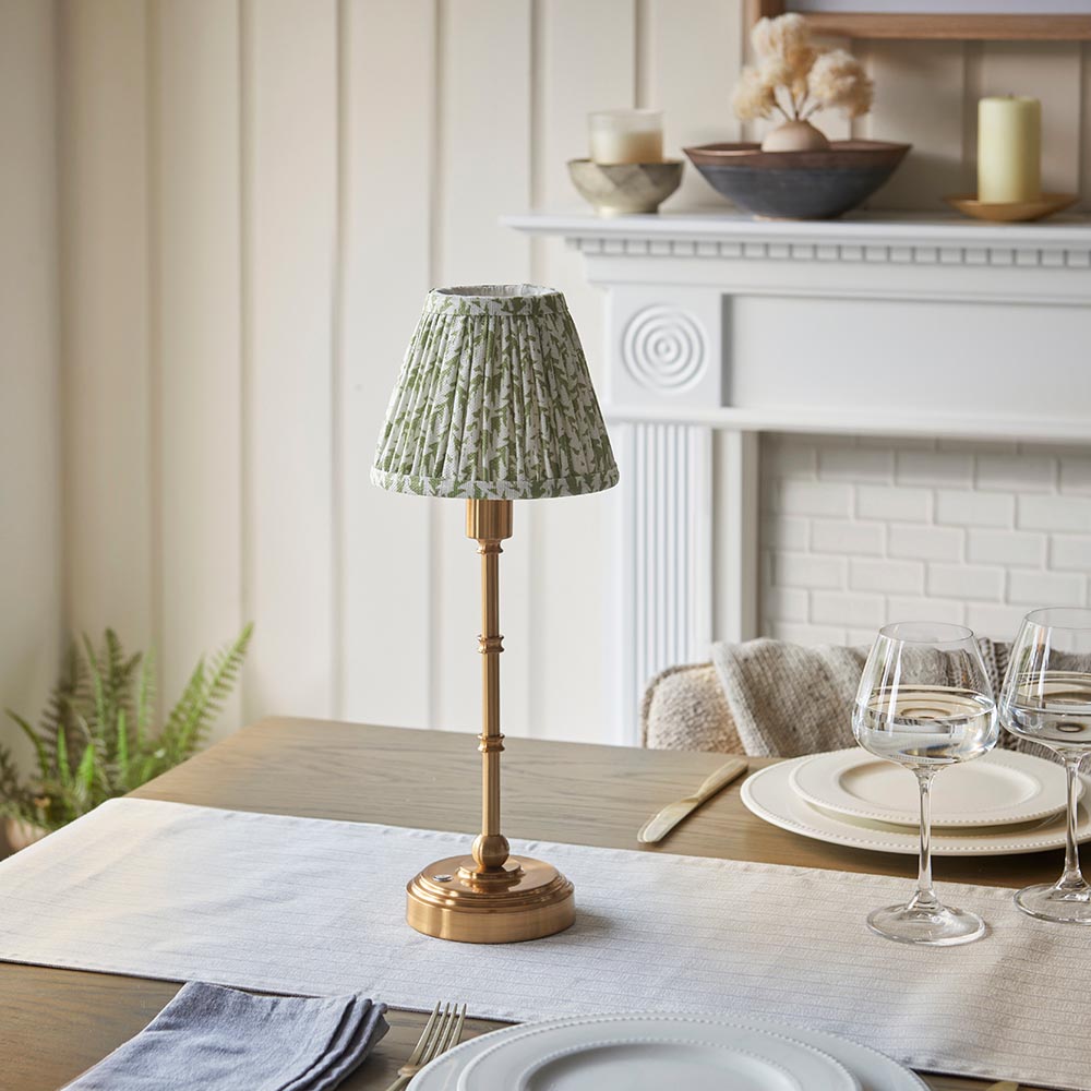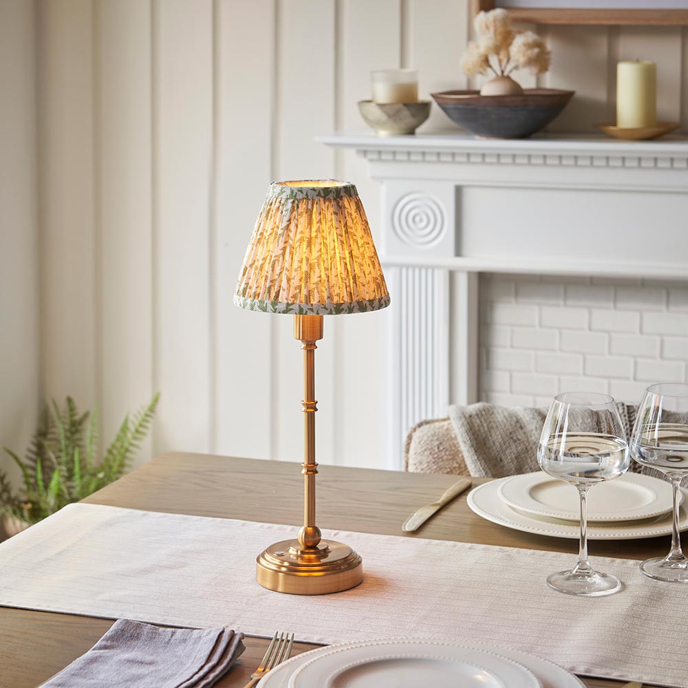Not tied down by the need for a power cable, this portable, rechargeable 3 stage touch dimmer table lamp enables you to select your own level of light. Classic in style and finished in aged brass making it easy to place around your home. Turn on for low light then touch controlled to increase light level to medium then bright, making it the perfect bedside light. Taking just 5.5 hours to fully charge and giving up to 36 hours of continuous light. Place on shelving, hallways, bedsides or dining tables, a truly versatile addition to your home. Paired with our subtle herb green 16cm Leaf clip-on shade for the perfect timeless style.
