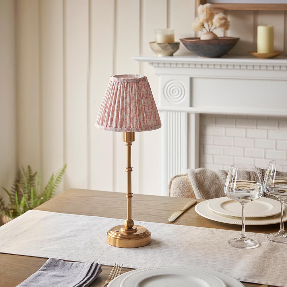 Not tied down by the need for a power cable, this portable, rechargeable 3 stage touch dimmer table lamp enables you to select your own level of light. Classic in style and finished in aged brass making it easy to place around your home. Turn on for low light then touch controlled to increase light level to medium then bright, making it the perfect bedside light. Taking just 5.5 hours to fully charge and giving up to 36 hours of continuous light. Place on shelving, hallways, bedsides or dining tables, a truly versatile addition to your home. Paired with our subtle peachy keen 16cm Leaf clip-on shade for the perfect timeless style.