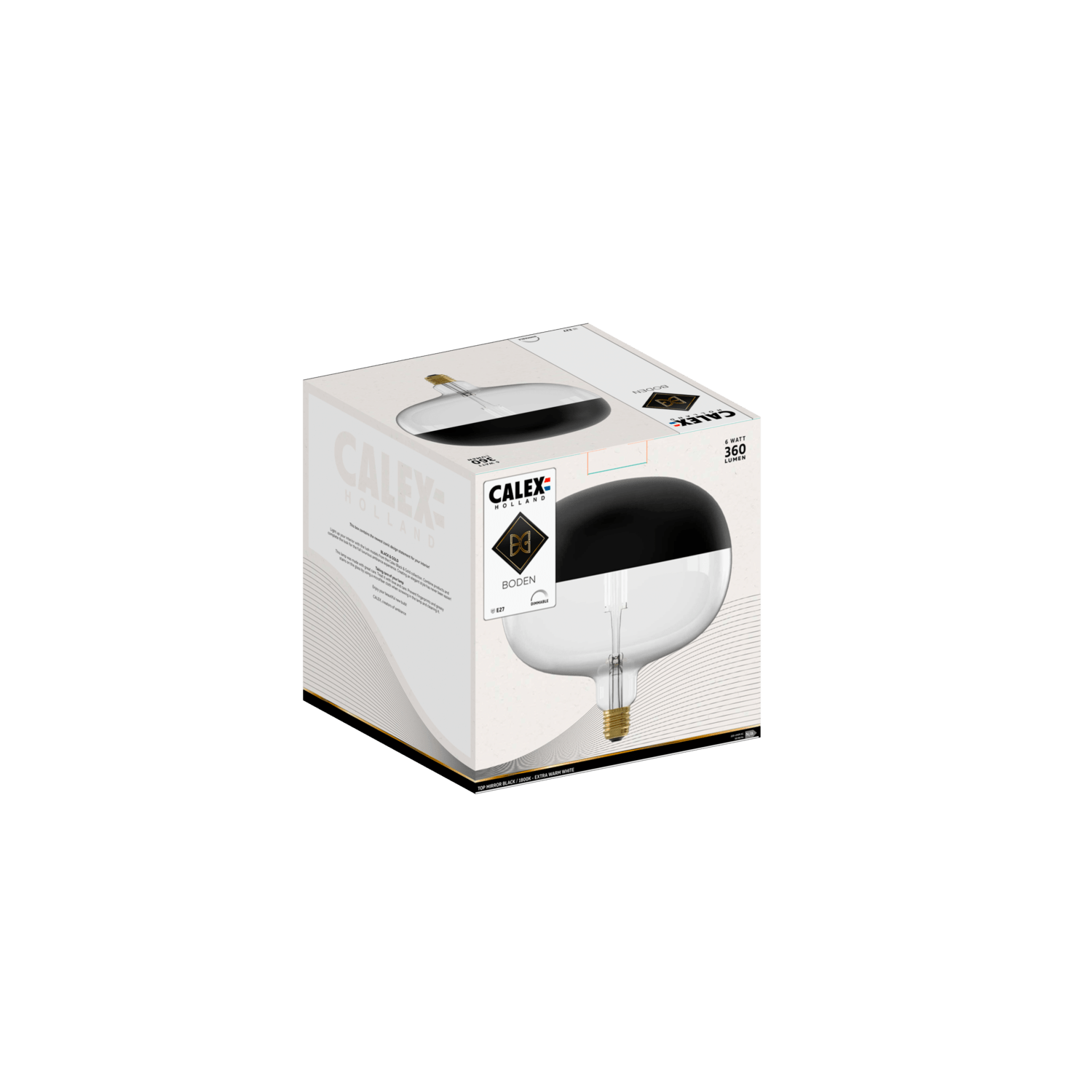 Illuminate your interior with the black Boden Top Mirror from the Calex Black & Gold collection. Combine products and complete the look for a complete luxurious ambiance experience. Creating an elegant style has never been easier! This lamp has a diameter of 220mm and a height of 225mm. The fitting is a normal E27 fitting, also called a large fitting, and fits most fixtures.