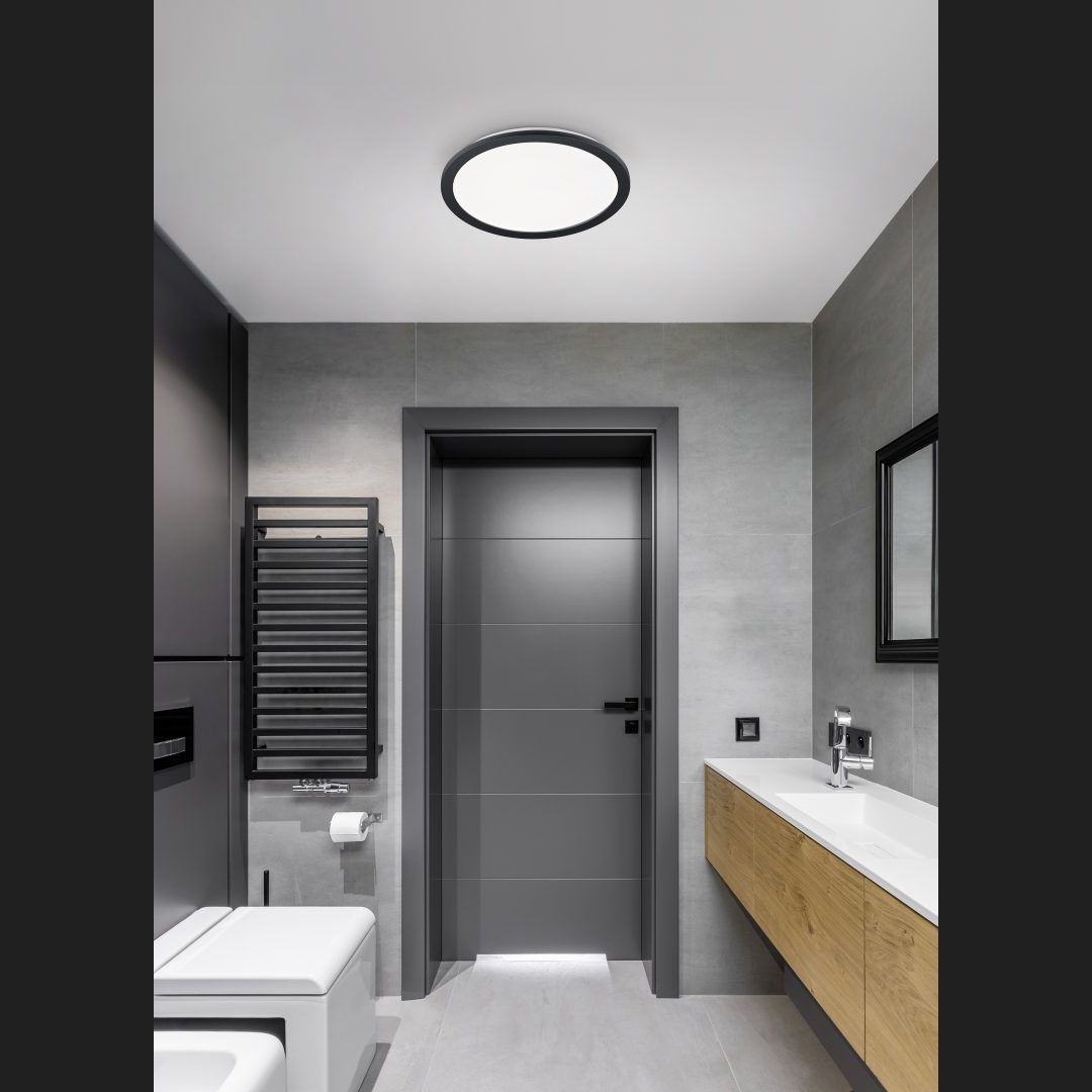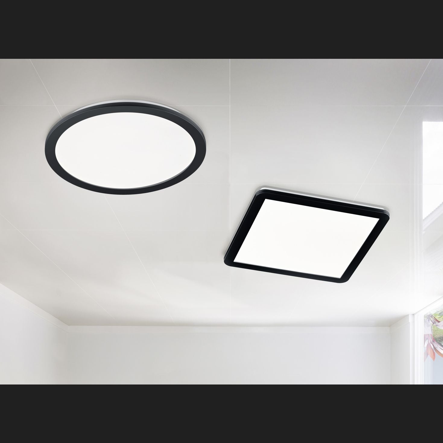 The CAMILLA round ceiling light can set the scene perfectly in your living area, as the luminaire impresses with a mix of modernity and straight lines. The timeless look and flat design open up numerous application and design options. Thanks to its IP44 protection rating, which means it is protected against splashing water, the light is ideal for installation in the bathroom. The integrated SWITCH dimmer can be used to adjust the light intensity from 100% to 50% and 25% using a conventional light switch. Thanks to the classic colour design in matt black and the white acrylic, the light can be combined with many furnishing styles. The luminaire also features modern LED technology, which is characterised by high light quality and energy efficiency. Compared to conventional halogen light sources, up to 80% of energy costs can be saved. LED light sources also have a long service life, generate less heat and protect the environment.