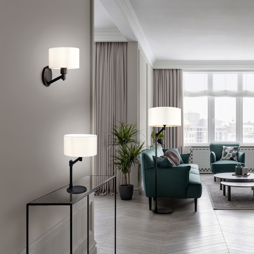 The luminaires of the CASSIO series with their textile shades create an atmospheric and cosy ambience. As the light of the wall lamp is gently emitted to the surroundings via the fabric shade, the lamp looks good next to the bed, where it comes into its own and creates a cosy ambience at the same time. For flexible use, the wall light is equipped with the FLEXconnect feature. This means that the luminaire is suitable for fixed connection both via the cord switch and directly without a cable feed. In this case, the luminaire is operated via a conventional wall switch. The simple and elegant design in black matt with white fabric shade sets decorative accents in your home. For energy-saving lighting, it is recommended to use an LED illuminant. These are an optimal alternative to conventional halogen lamps and stand for a high quality of light and energy savings of up to 80%. In addition, LED lamps help you benefit from a long service life, low heat generation and at the same time protect the environment.