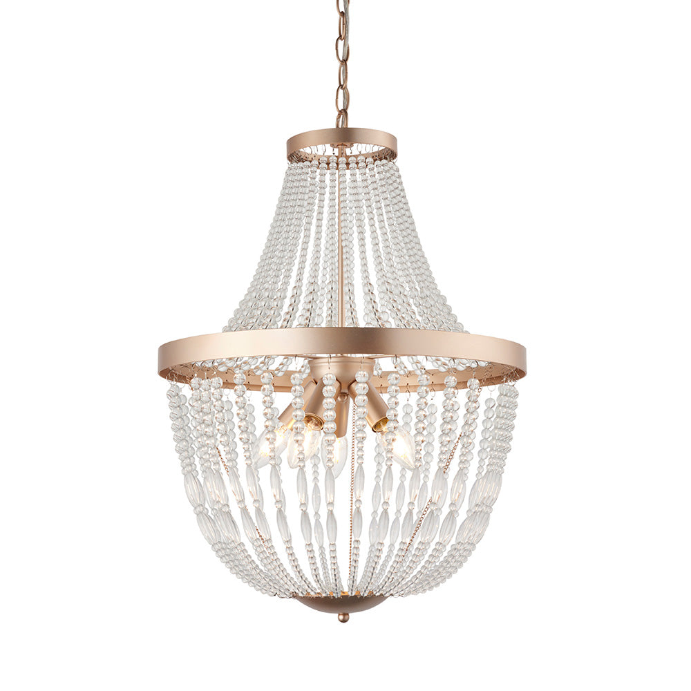 A modern twist on the classic chandelier with a tiered drop. Features rose gold effect detailing and clear glass beads to create gorgeous lighting and add a touch of romance and softness to any room.