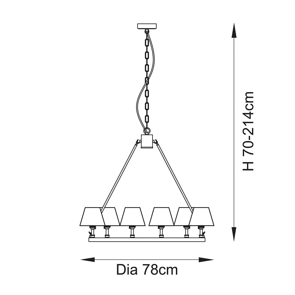 The timeless simplicity of a hoop design, finished in aged brass plate with authentic brass B22 lamp holders, make it the perfect addition to your home; with height adjustable chain and twisted fabric flex. Completed with 6 of our stylish pearl grey 16cm Zigzag shades for a timeless chandelier to be proud of.