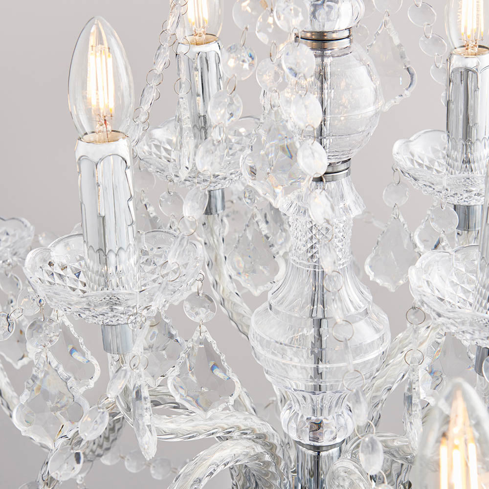 A 12 light chandelier with clear acrylic beading, facets and droplets. Comes with a fully adjustable chain to extend the drop of the light up to a maximum 1.8m. Also available in 2 sizes