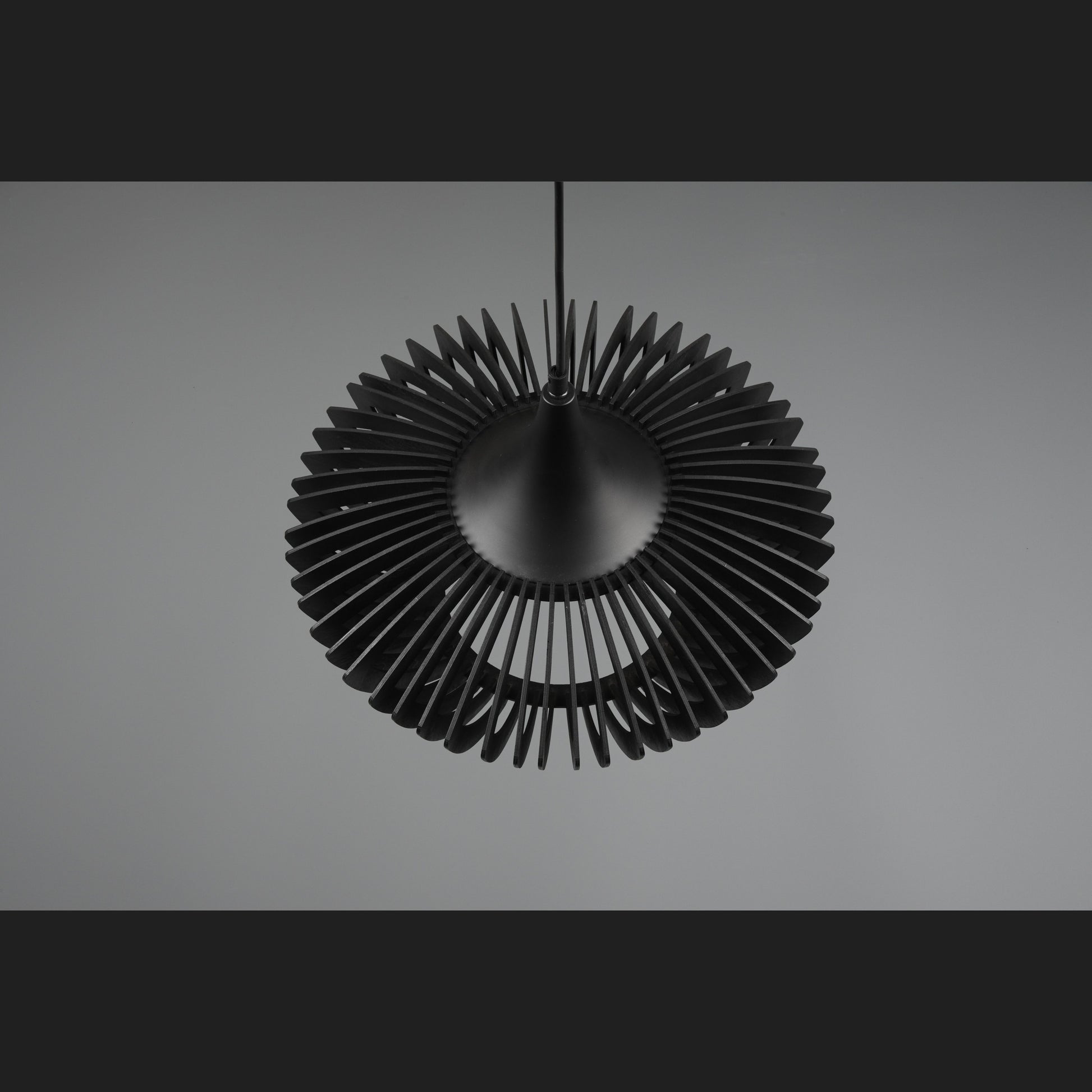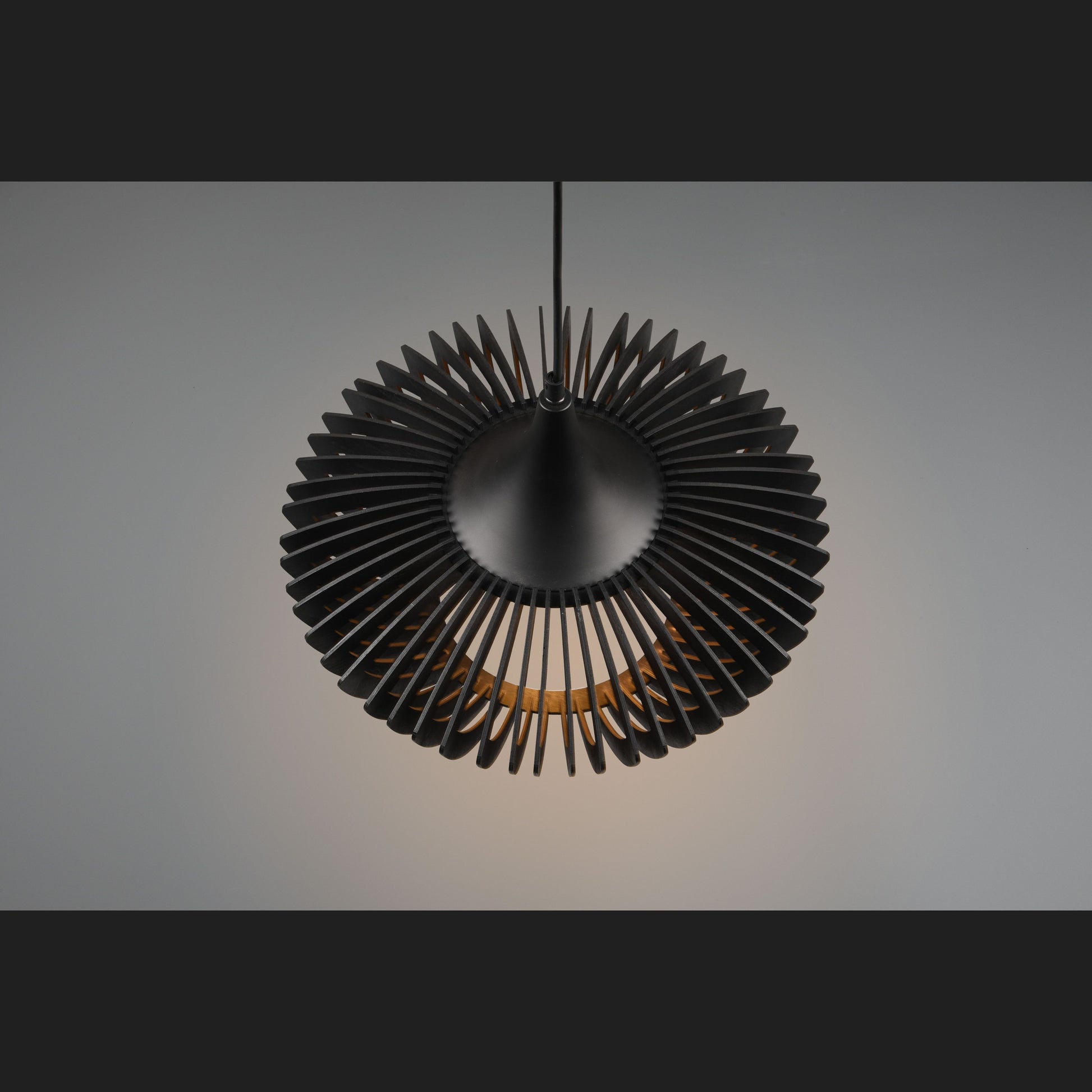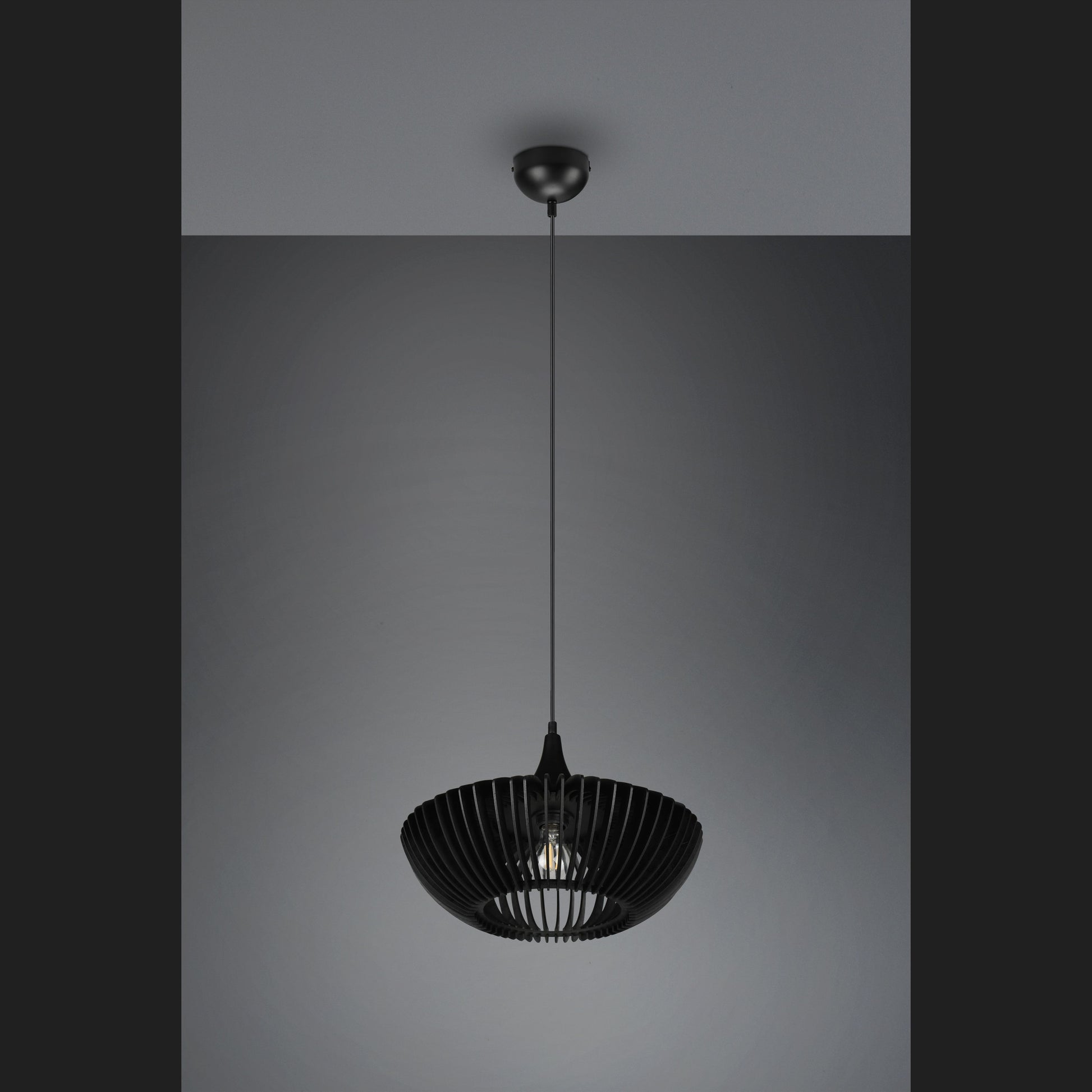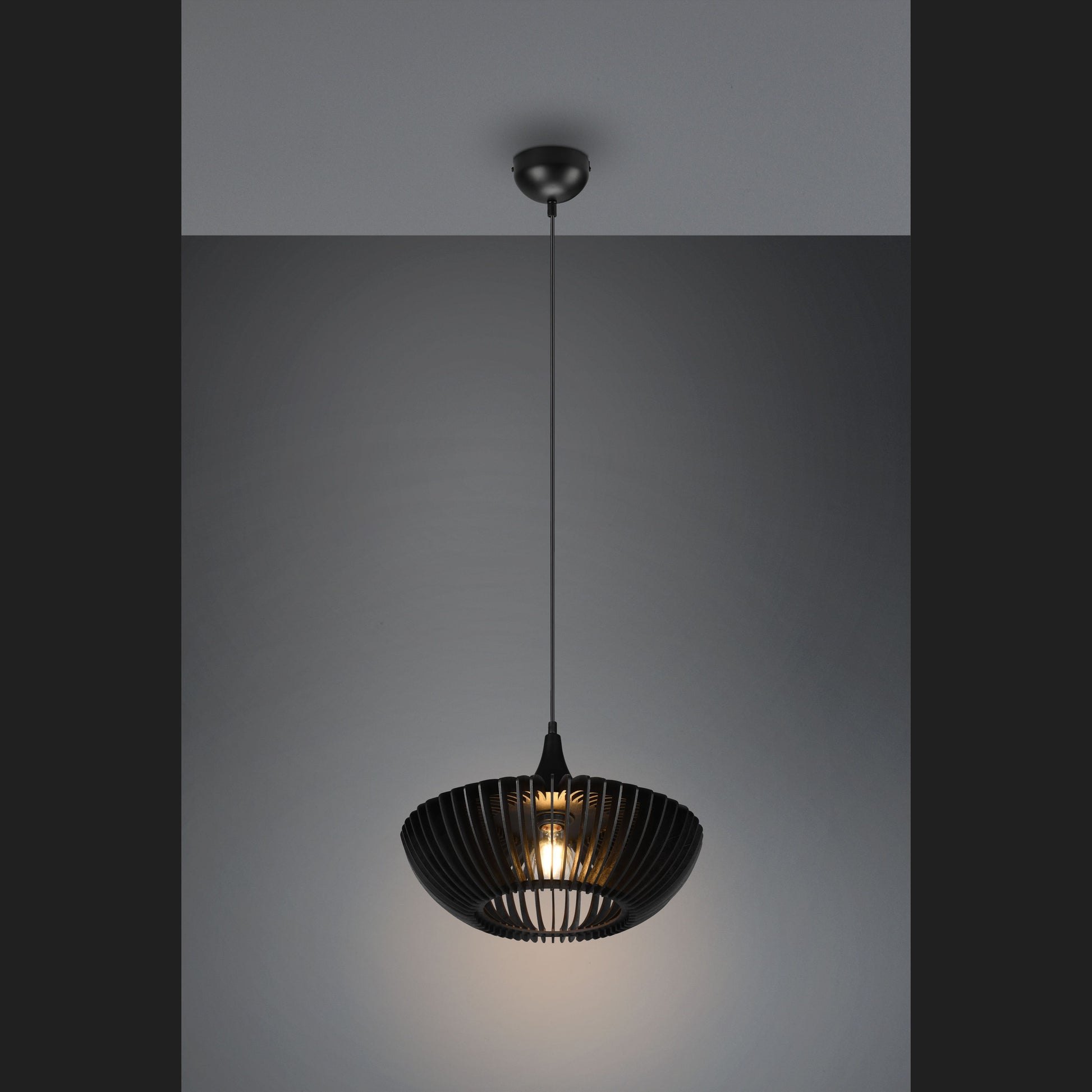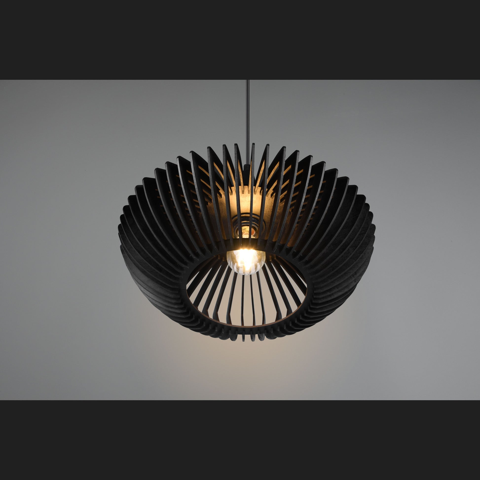 The COLINO pendant lamp radiates grace and elegance with its shade made of wooden slats. The striking curved design creates a warm and cosy lighting atmosphere and tastefully enriches your premises and interior style. The black wood in combination with metal in matt black has a harmonious effect and sets modern accents. For energy-saving lighting, it is recommended to use an LED illuminant. These are an optimal alternative to conventional halogen lamps and stand for a high quality of light and energy savings of up to 80%. In addition, LED lamps help you benefit from a long service life, low heat generation and at the same time protect the environment.