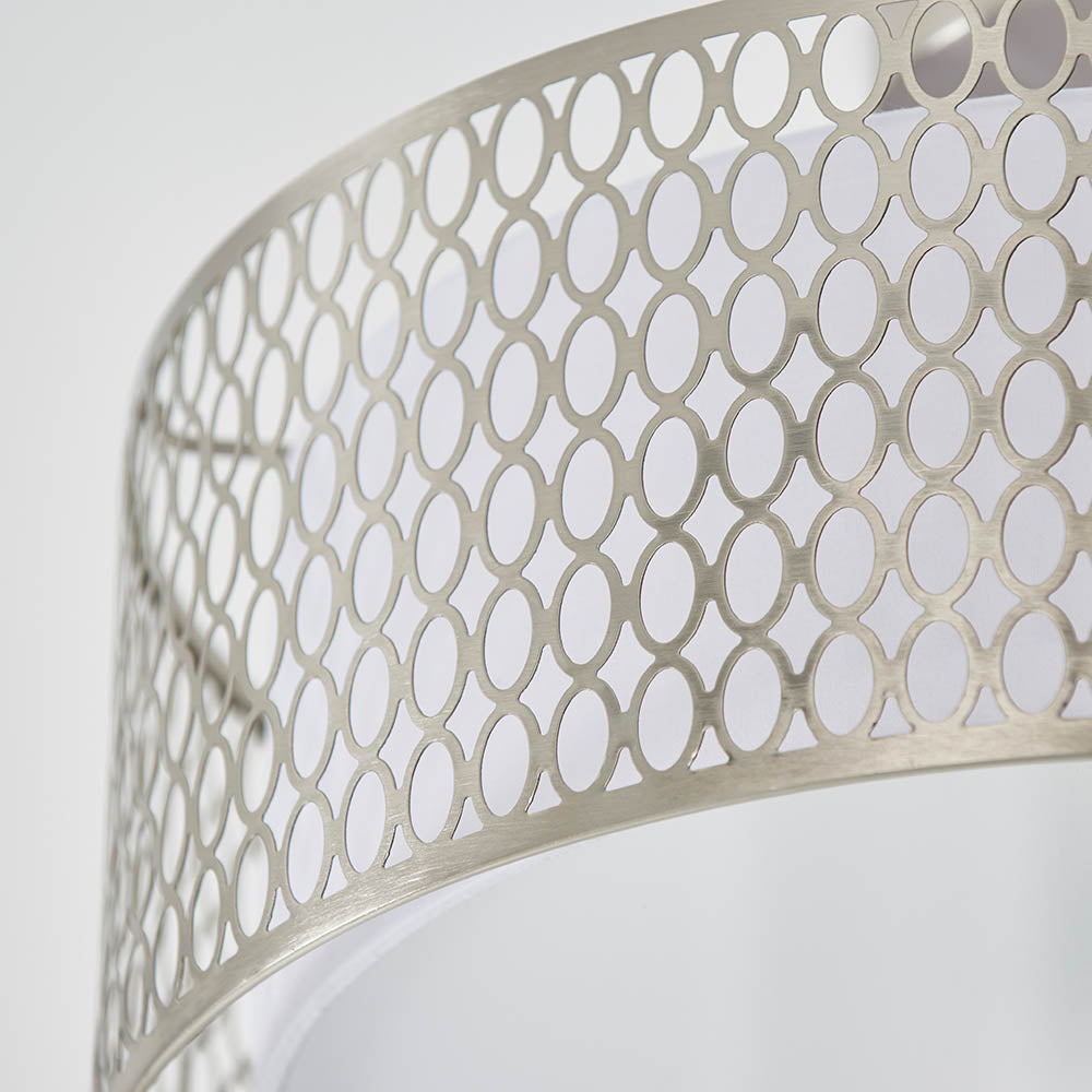 No compromise on design for low ceilings. This is a classic circular light with a trendy geometric fretwork metal outer and an inner fabric shade for lovely light diffusion. In a satin nickel effect plate finish with frosted glass, this light would compliment a range of interior style. This product is also dimmable to create a relaxing atmosphere.