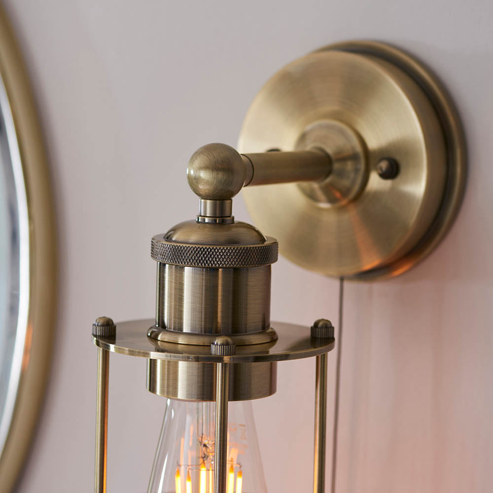 Add industrial styling with this timeless IP44 rated wall light. Machine knurled detailing and antique brass bold cage design contrast with LED filament lamps.