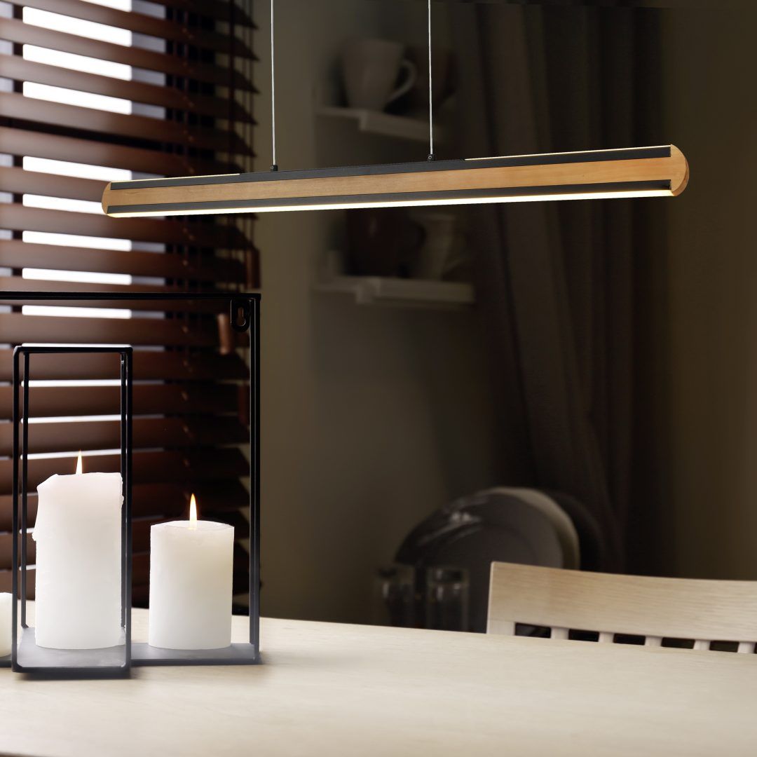 With the stylish material mix of wood and metal, DEACON gives living rooms a special atmosphere. The light colour and brightness can be conveniently regulated via a touch function on the luminaire. In addition, the luminaire convinces with a light outlet upwards and downwards. The colour design in matt black in combination with the light wood provides modern, homely accents. In addition, the luminaire features modern LED technology, which is characterised by high light quality and energy efficiency. Compared to conventional halogen lamps, up to 80% of energy costs can be saved. In addition, LED light sources have a long service life, produce less heat and protect the environment.