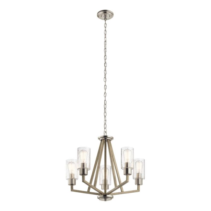 The Deryn 5-light chandelier, delivers a minimalist style with crisp, clean lines and an inverted diamond shape structure. Accented with clear seeded glass and a Distressed Antique Grey finish - making it the perfect addition to refined rustic and coastal settings.