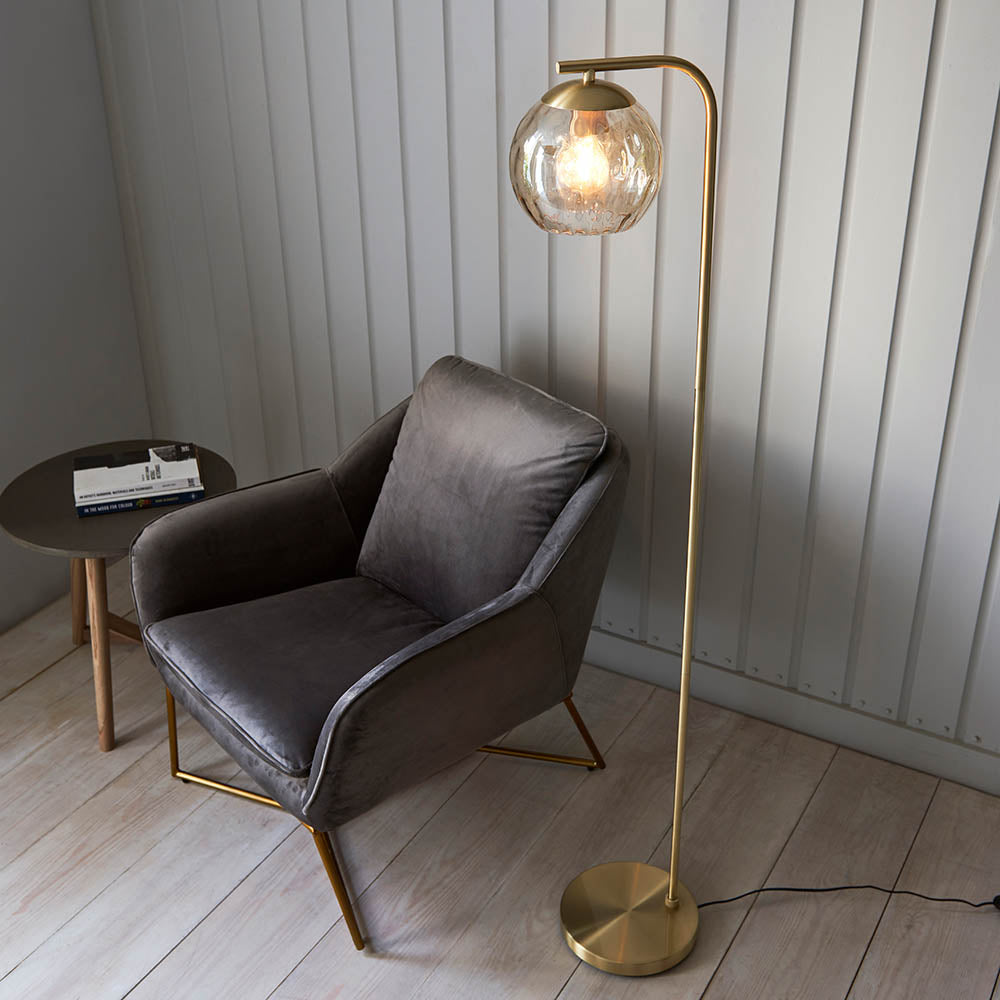 Champagne lustre glass meets classic brushed brass plating in a combination of modern classic styling. This easily placeable floor light is the perfect addition to your modern home. Add a touch of style to your interior with a matching ceiling light, wall light and table lamp. Ideal when paired with E27 LED lamps.