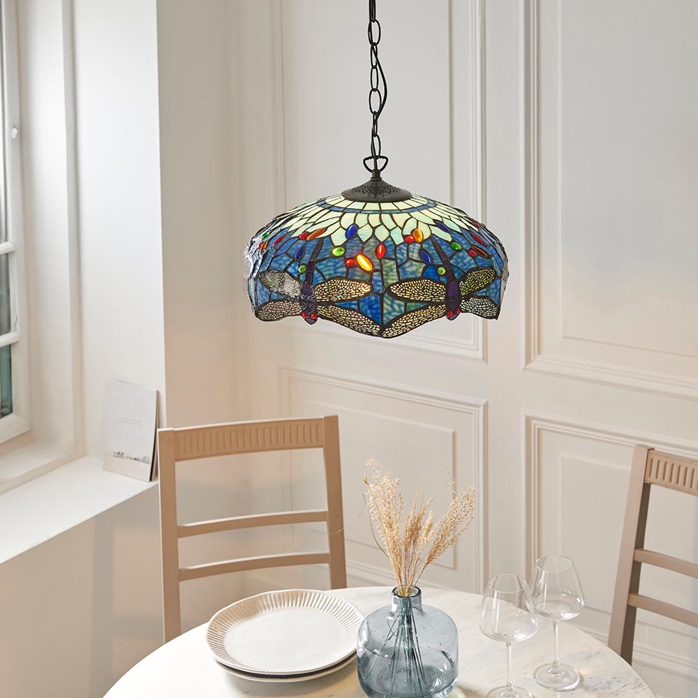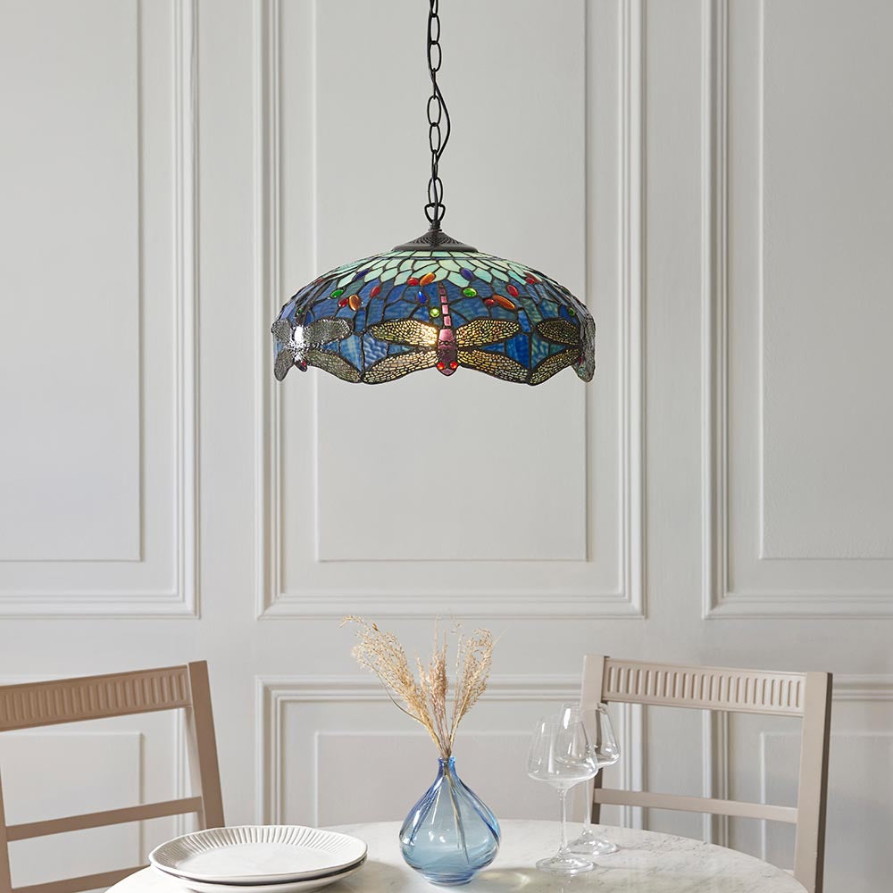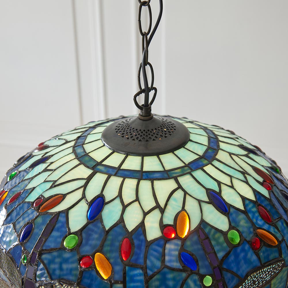 A stunning 3 light pendant with the iconic Tiffany Dragonfly design in a vivid blues with multi coloured glass beading. Teamed with a satin black fitting. Dimmable and compatible with LED lamps