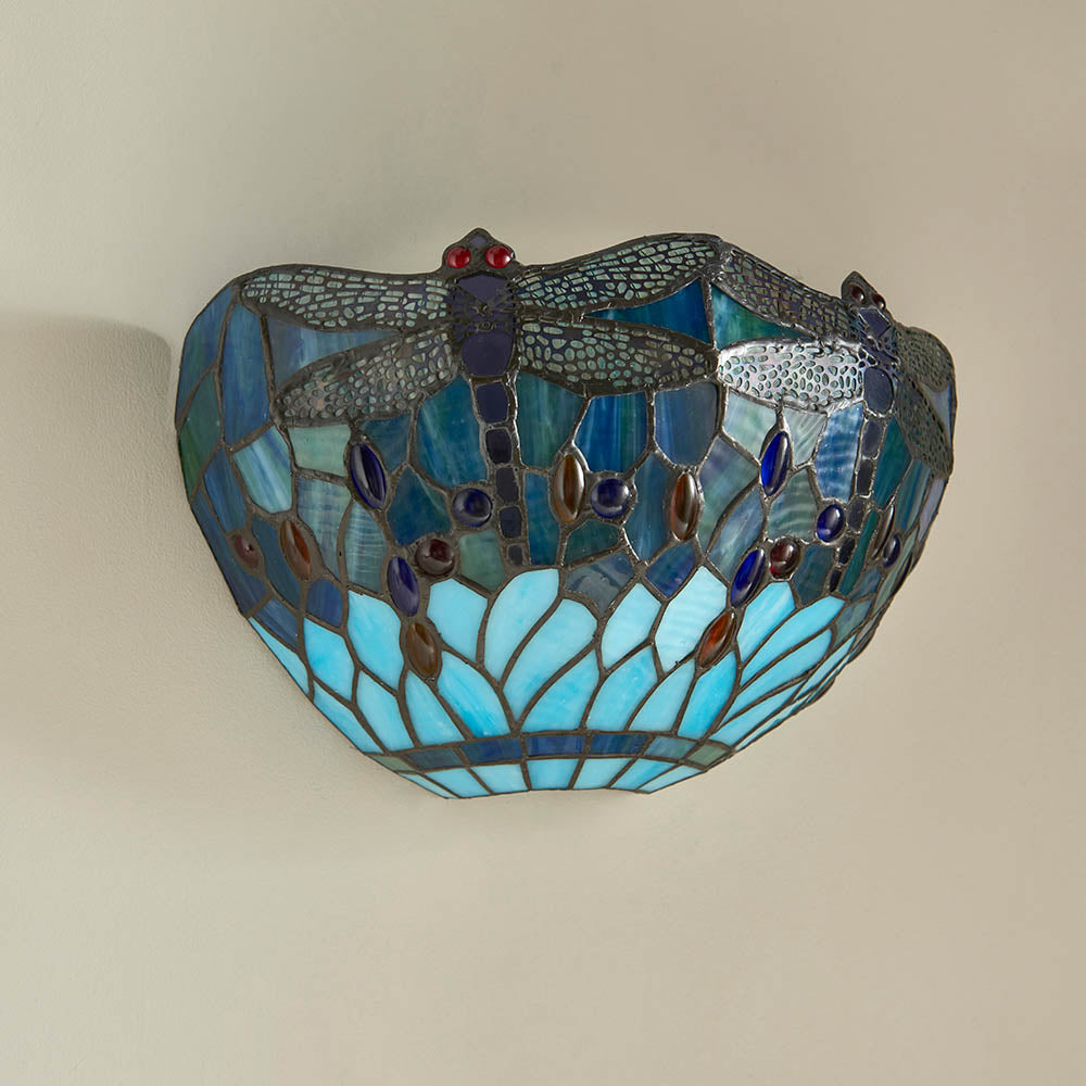 A stunning wall light shade with the iconic Tiffany Dragonfly design in a vivid blues with multi coloured glass beading. Dimmable and compatible with LED lamps. Due to the nature of the product and its manufacture, there may be variations in colour and finish.