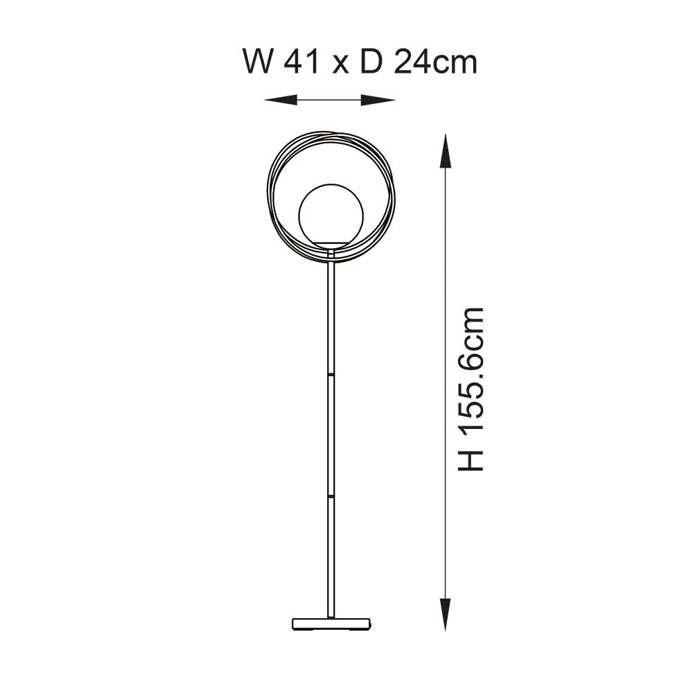Featuring three interlinking brushed gold rings encircling a single opal glass orb to complete this contemporary designed floor light. Combine with matching items in the range for a coordinated look.