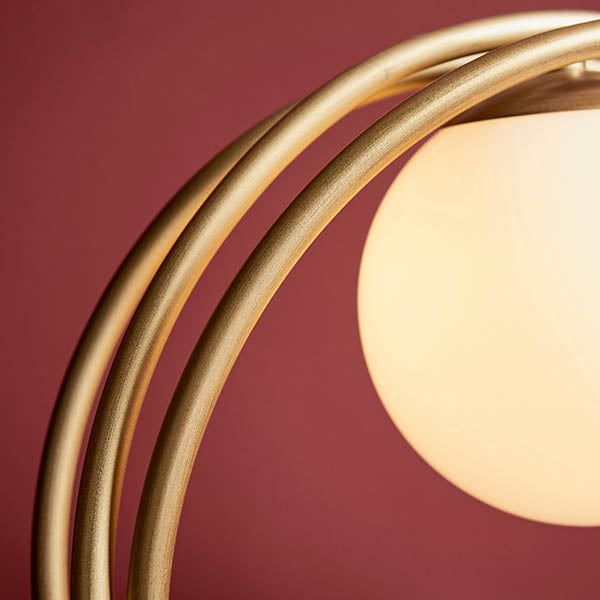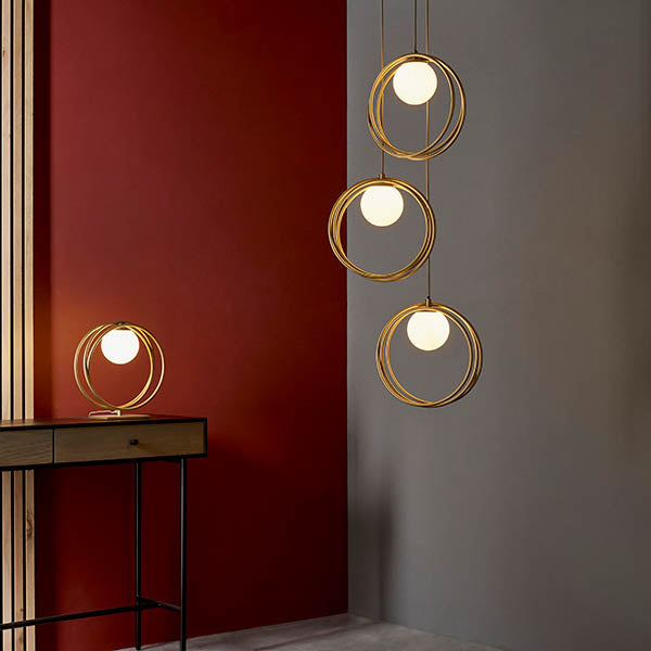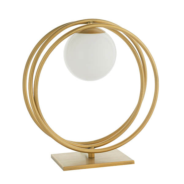 A sculpture in its own right, this table light features a single opal glass sphere encircled by three interlinking brushed gold rings. Anchored by a rectangular base, also in a brushed gold finish. Combine with matching items in the range for a coordinated look.
