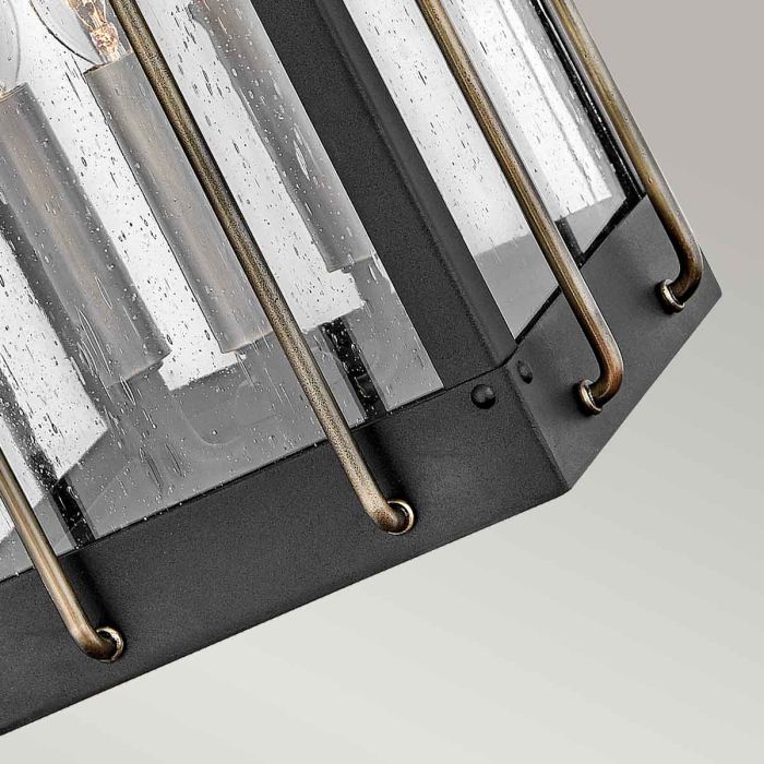 The Large Fitzgerald is constructed of Aluminium and Brass with clear seeded glass panels. The design takes its influences from industry while maintaining a high quality finish in Textured black with Burnished Bronze. IP44 Rated
