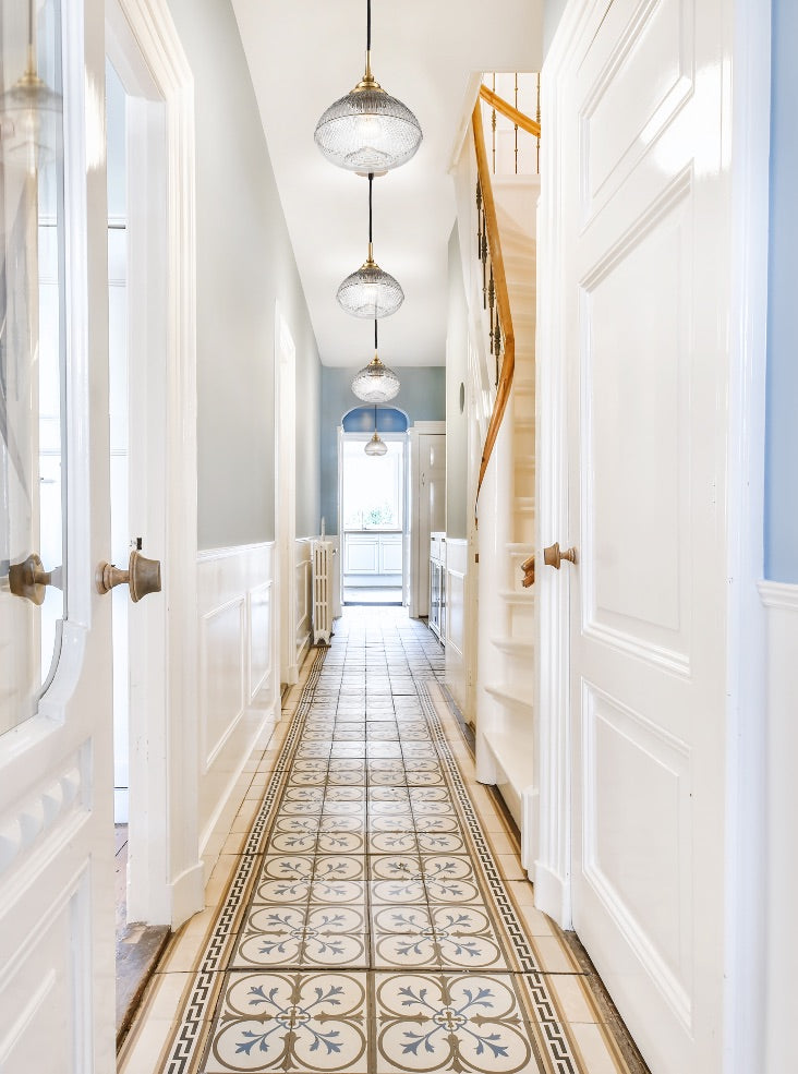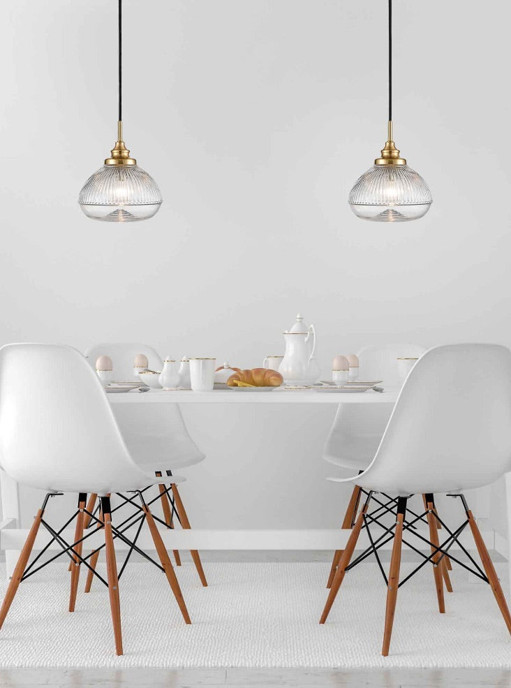 Brushed brass pendant with clear ribbed, enclosed glass with a slightly inverted base.