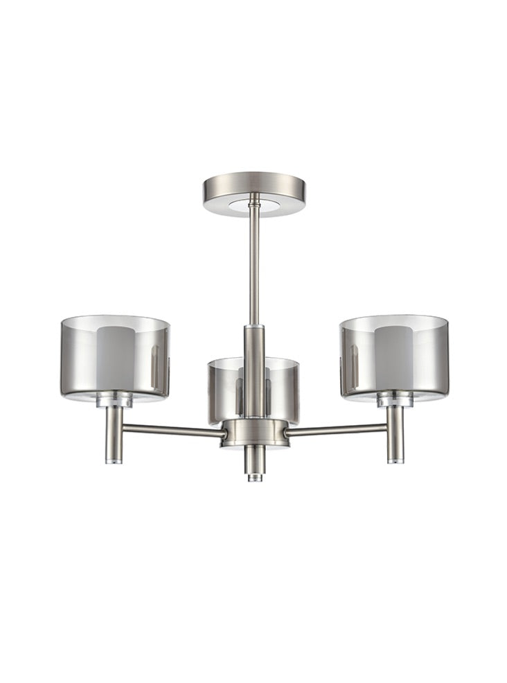 Satin nickel and chrome finish three light pendant with smoked glass and frosted glass diffusers to cover the lamps.