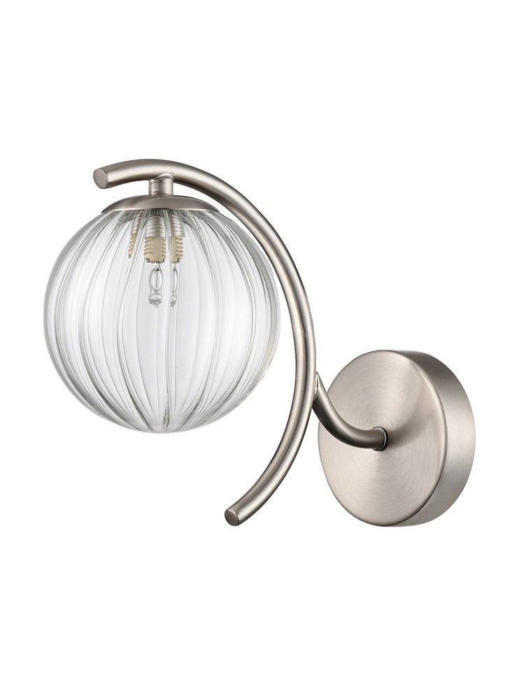 A single wall light in satin nickel finish with clear ribbed glass sphere.