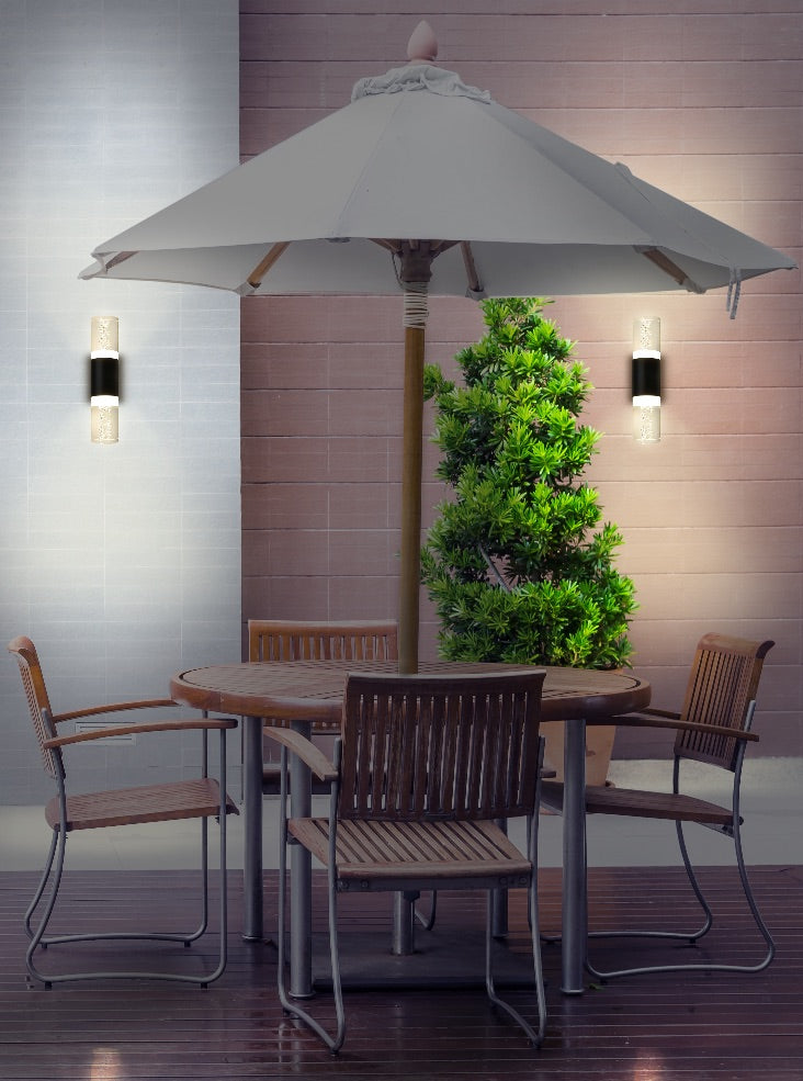 Matt black finish LED wall light which offers bi-directional illumination through two clear bubble effect acrylic tubes. Rated IP54. Non-dimmable.