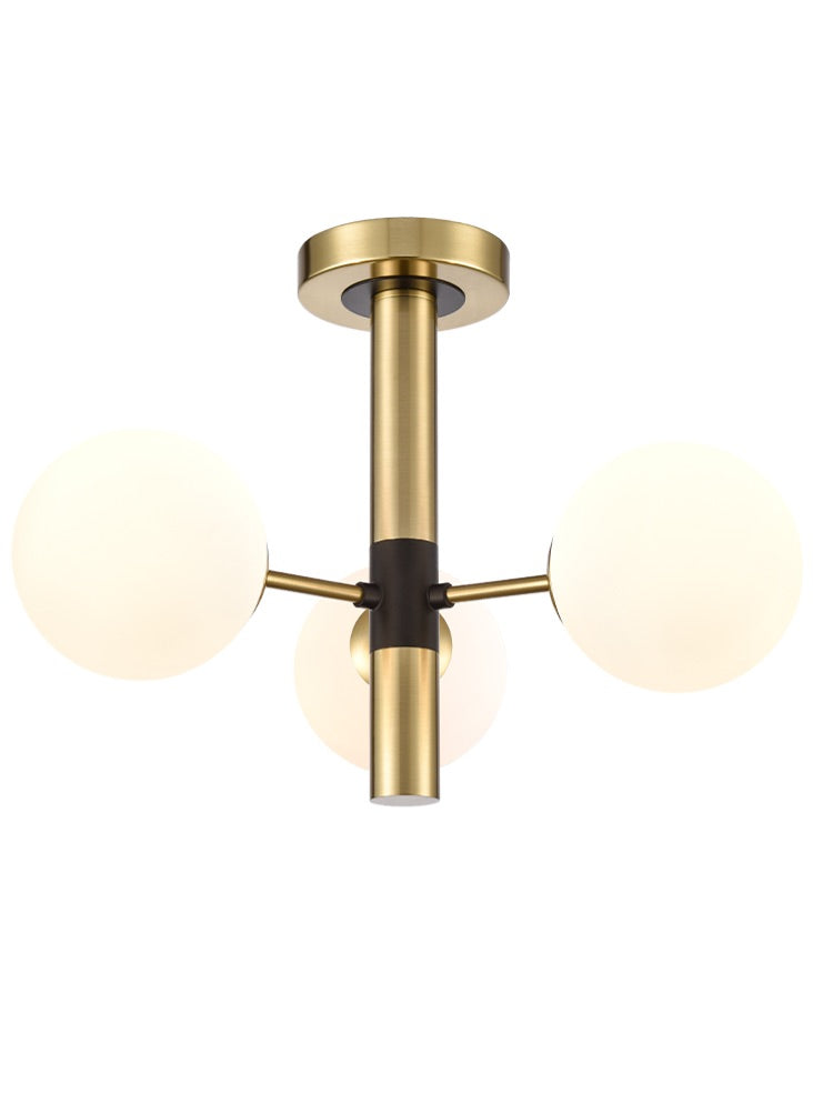 Matt black and aged brass finish 3-light semi flush fitting with opal glass spheres.