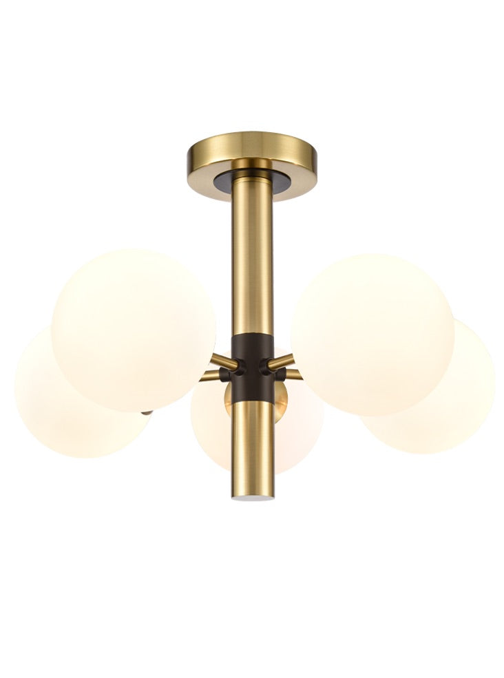 Matt black and aged brass finish 5-light semi flush fitting with opal glass spheres.