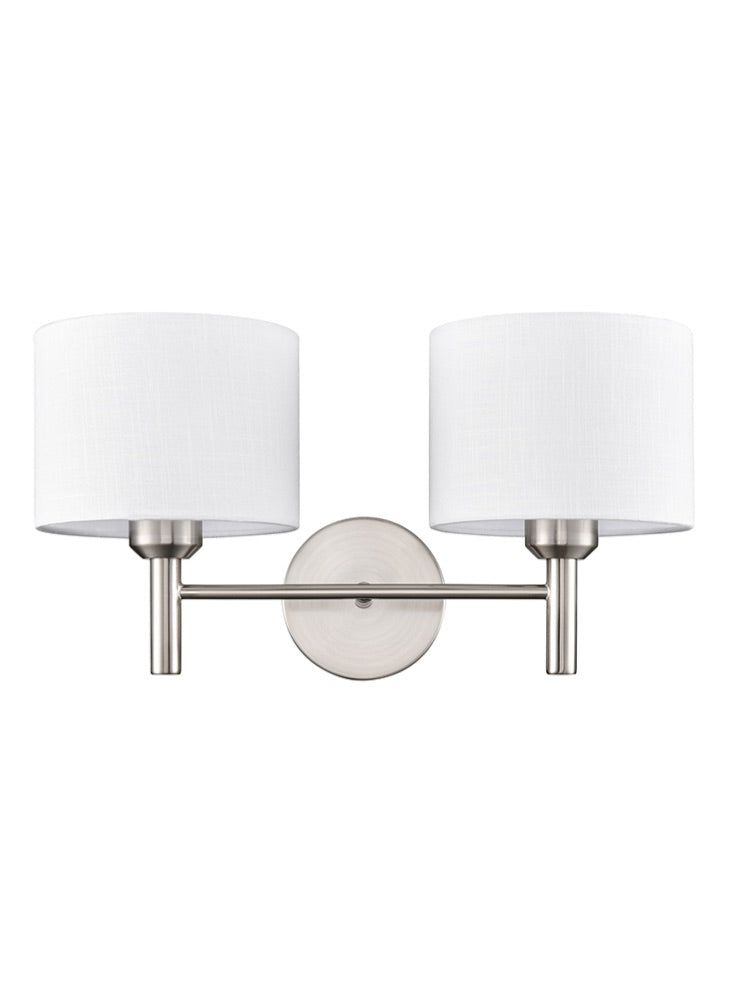 A double wall light in satin nickel finish with off-white textured fabric shades.