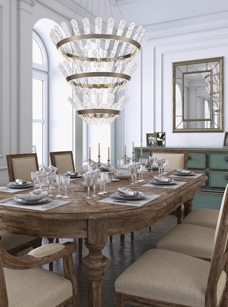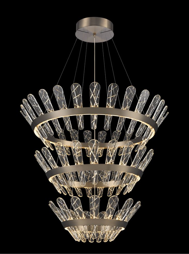 A triple tiered LED pendant in brushed brass finish with delicate crystal glass.
